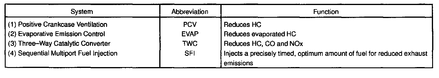 The emission control systems are installed to reduce the amount of CO, HC and NOx exhausted from the engine ((3) (4) and (5)), to prevent the atmospheric release of blow-by gas-containing HC (1) and evaporated fuel containing HC being released from the fuel tank (2).
