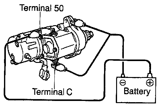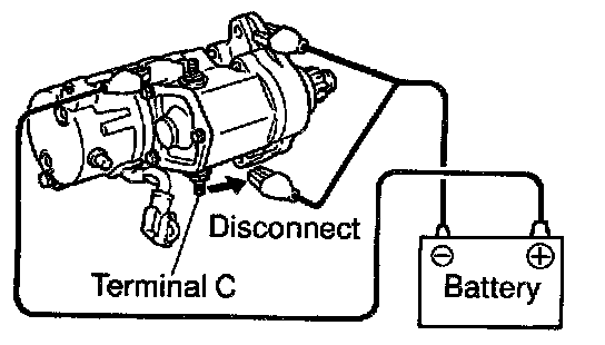 While connected as above with the pinion gear out, disconnect the negative (-) lead from terminal C. Check that the pinion gear remains out.