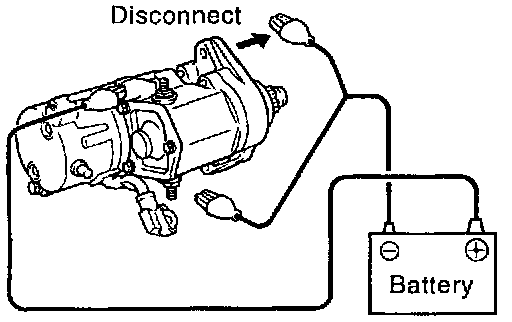 Disconnect the negative (-) lead from the starter body. Check that the pinion gear returns inward.
