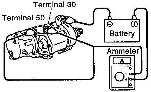 b. Check that the starter rotates smoothly and steadily with the pinion gear moving out. Check that the ammeter shows the specified current.