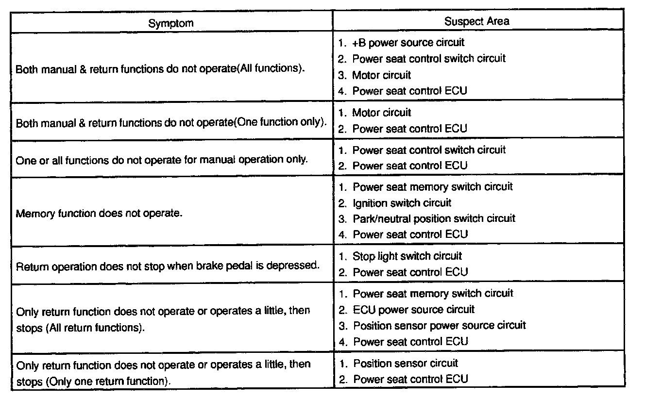- If the trouble still reappears even though there are no abnormalities in any of the other circuits, then check and replace the Seat Position Control ECU as the last step.