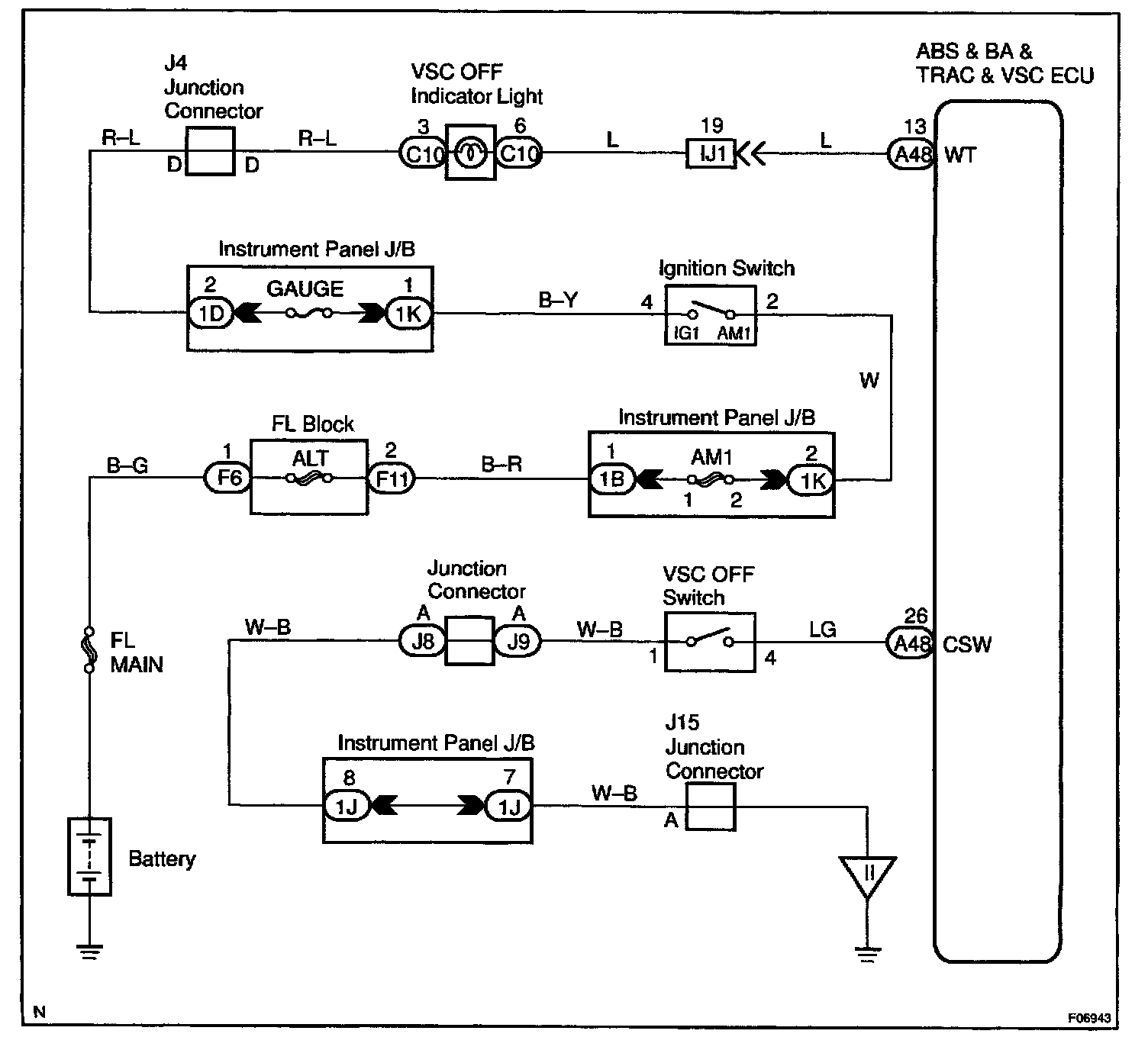 CIRCUIT DESCRIPTIONThis is the TRAC & VSC control main switch. When the VSC OFF switch is pushed, TRAC & VSC control is not activated and VSC OFF indicator light lights up. When the switch is pressed again,VSC OFF indicator light goes off, and the control is actuated. Turn the ignition switch OFF, TRAC & VSC control surely comes on when the ignition switch turns ON next time.