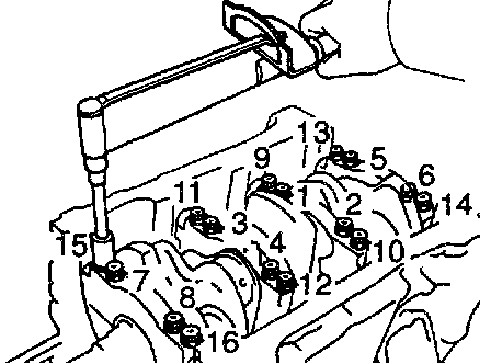 b. Install and uniformly tighten the 16 main bearing cap bolts in several passes and in the sequence shown.