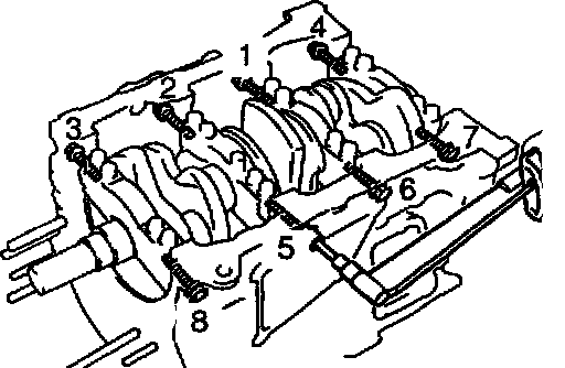 b. Install and uniformly tighten the 8 main bearing cap bolts in several passes and in the sequence shown.