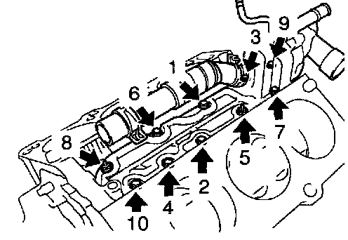 c. Install the water inlet housing with the 8 bolts and 2 nuts. Uniformly tighten the bolts and nuts in several passes and in the sequence shown.