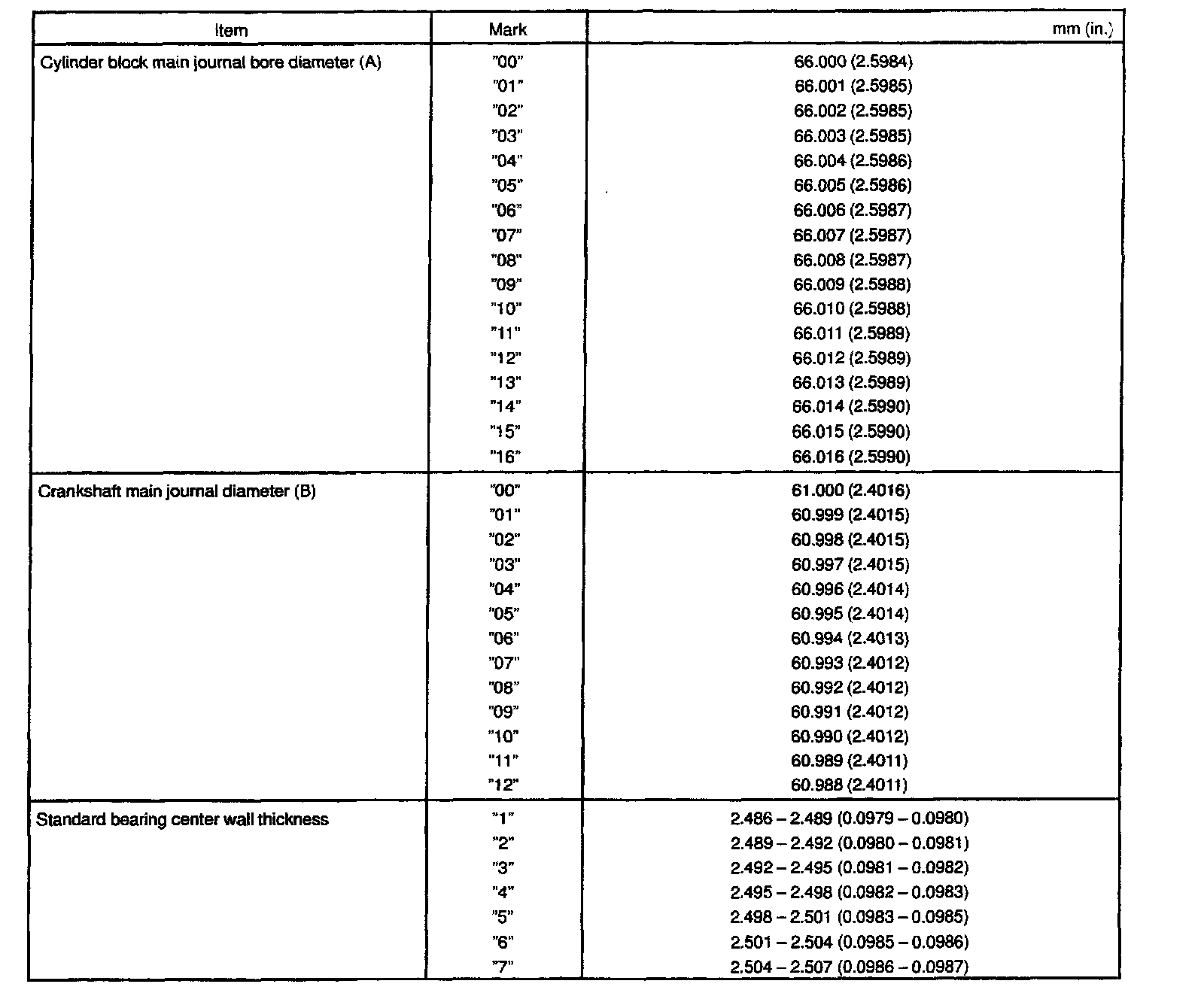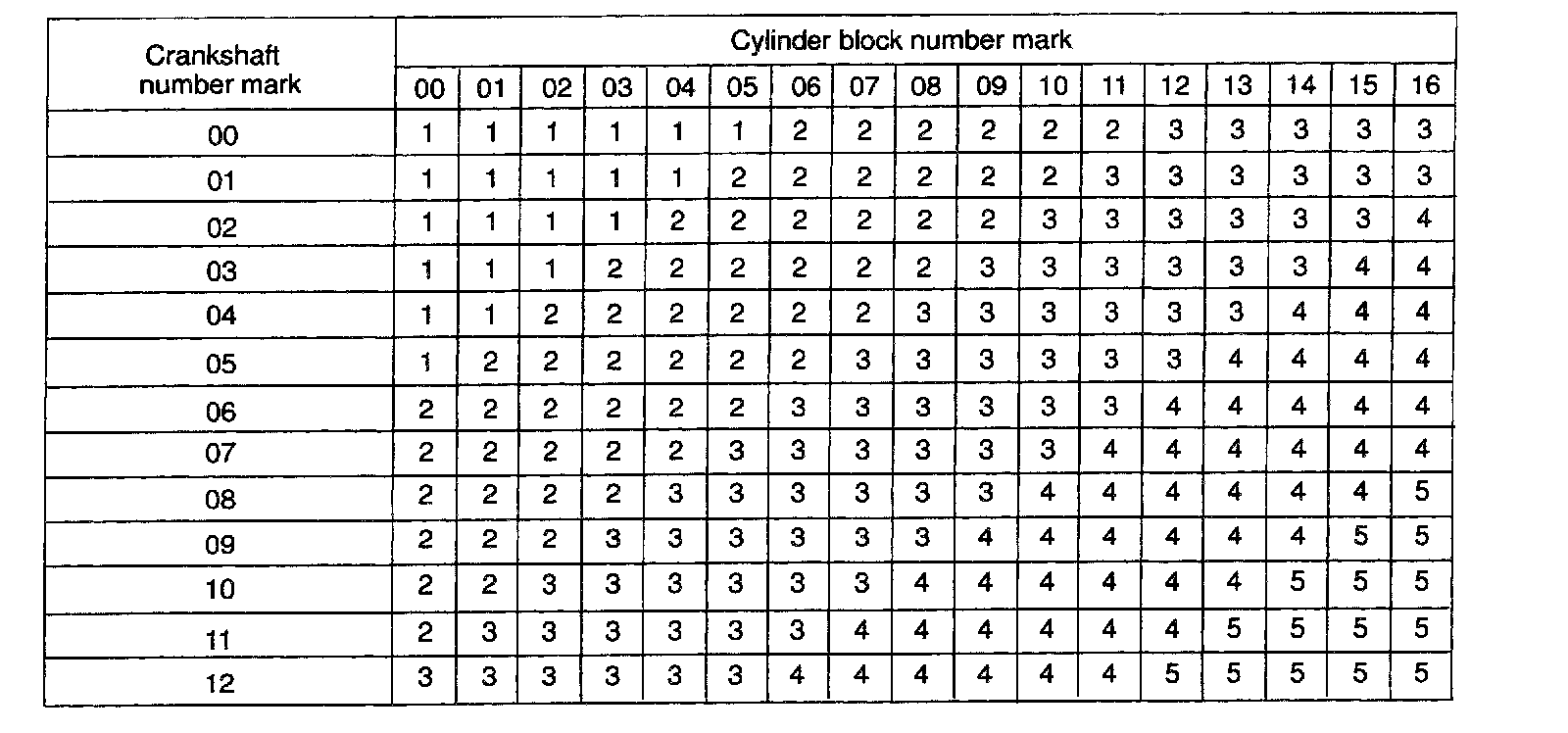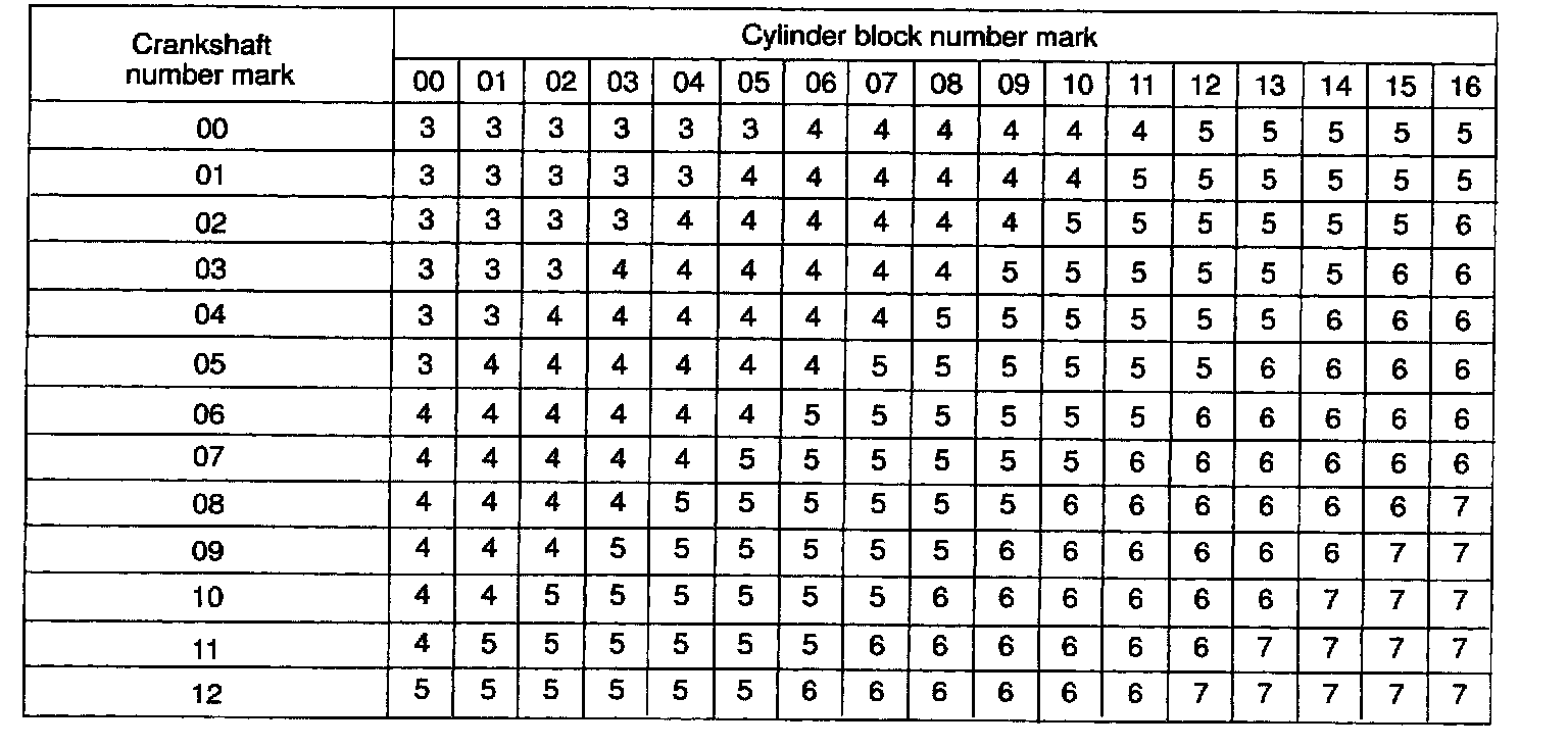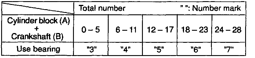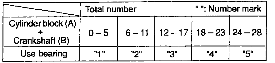 HINT: If using a bearing, replace it with one having the same number. If the number of the bearing cannot be determined, select the correct bearing by adding together the numbers imprinted on the cylinder block and crankshaft, then refer to the table for the appropriate bearing number. The No.1 and No.4 journal bearings have 5 standard bearing sizes, marked "3", "4", "5", "6" and "7" accordingly. The No.2 and No.3 journal bearings have 5 standard bearing sizes, marked "1", "2", "3", "4", and "5" accordingly.