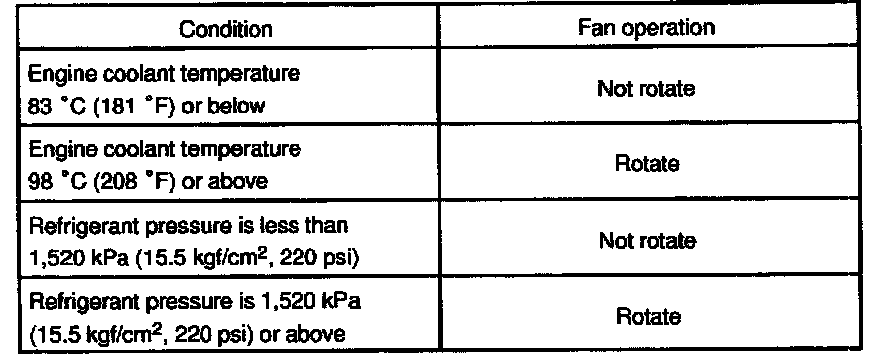 If operation is as specified, check the pressure switch, cooling fan relays and engine coolant temperature switch.