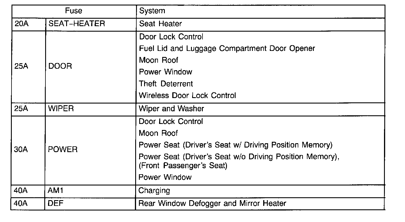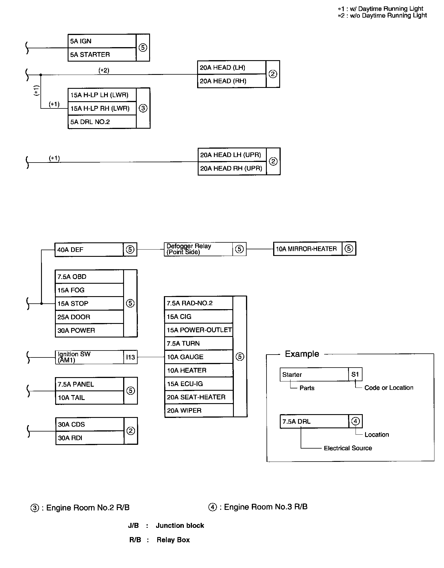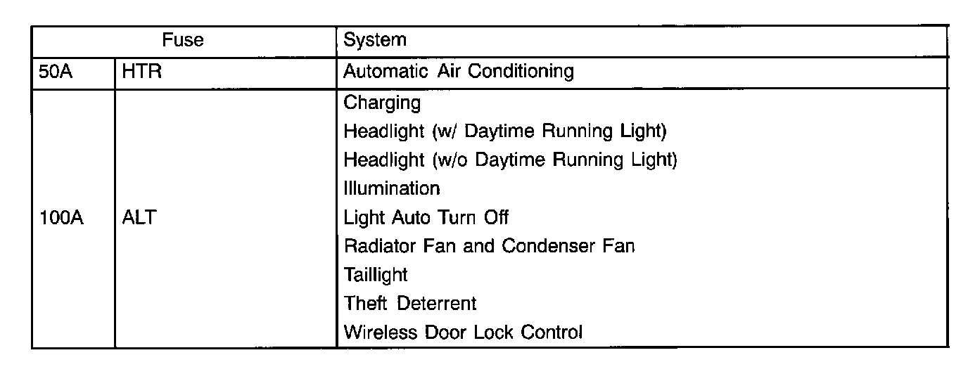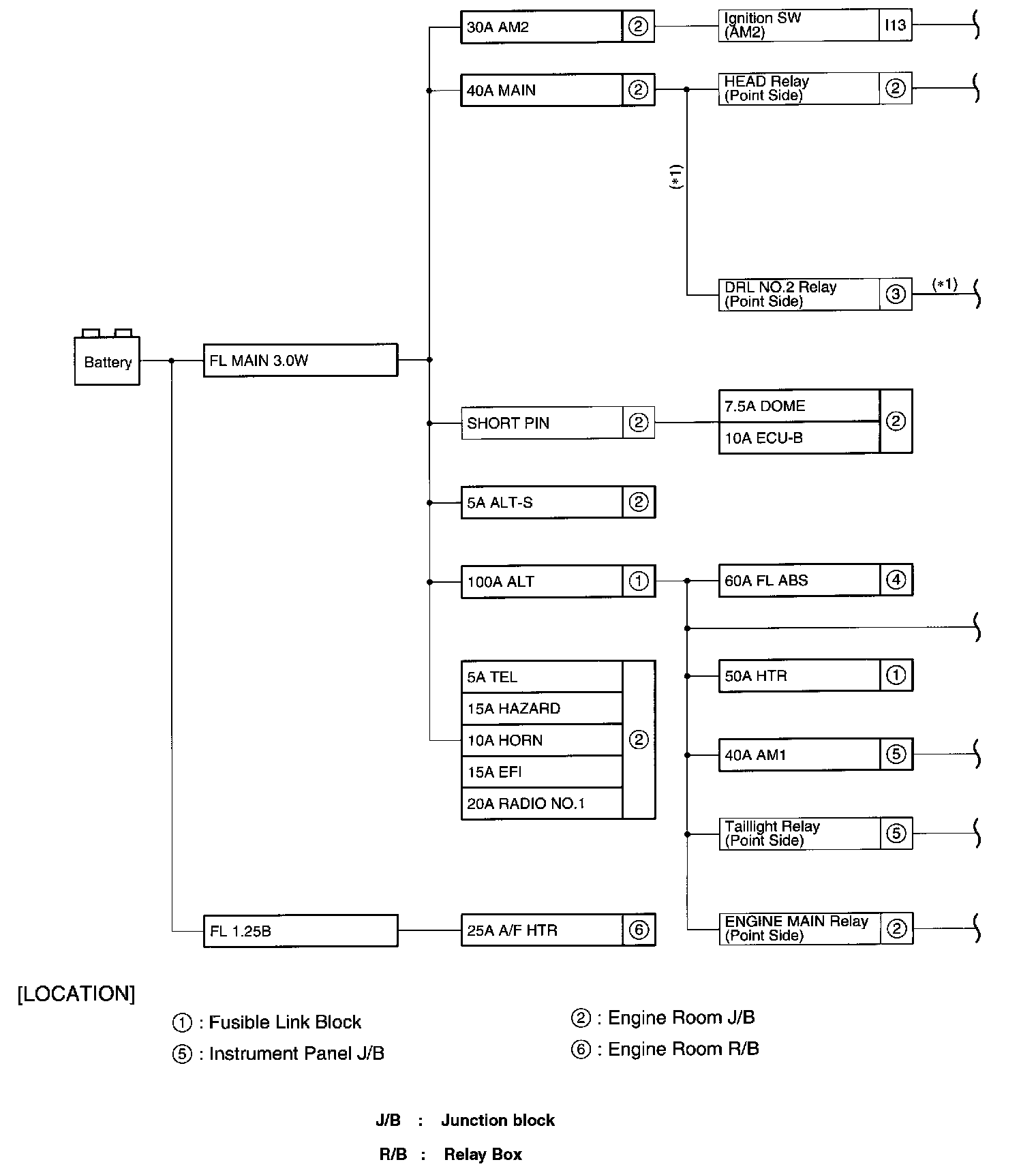 The chart shows the route by which current flows from the battery to each electrical source (Fusible Link, Circuit Breaker, Fuse, etc.) and other parts.
