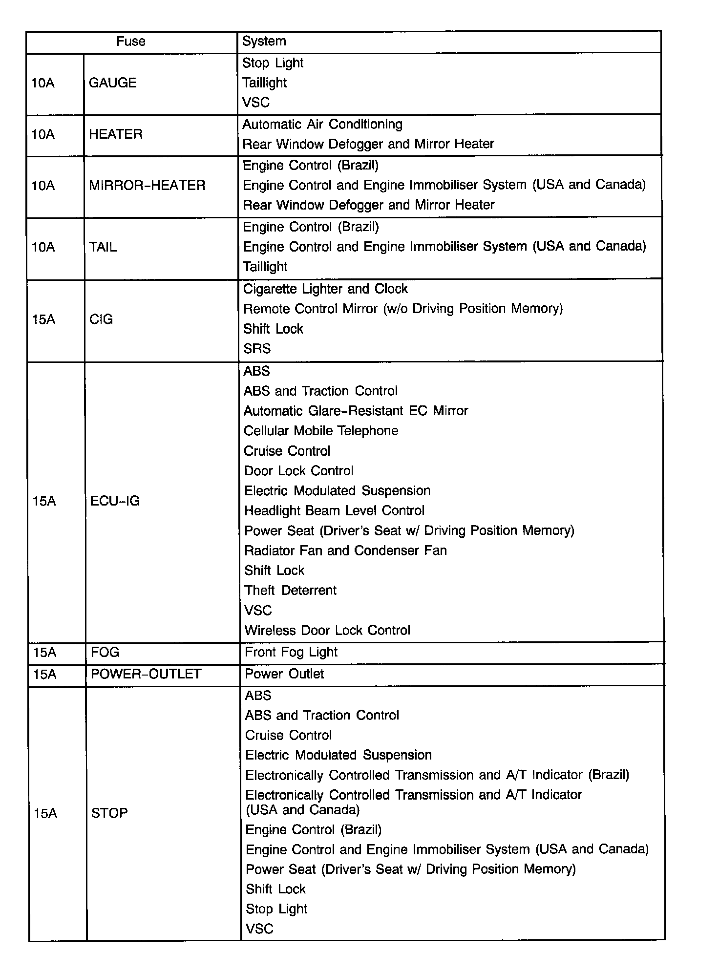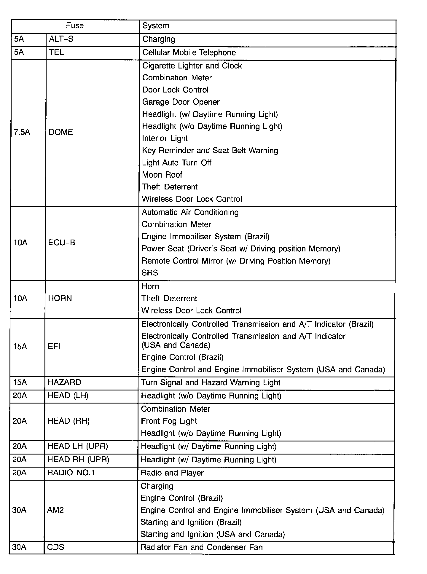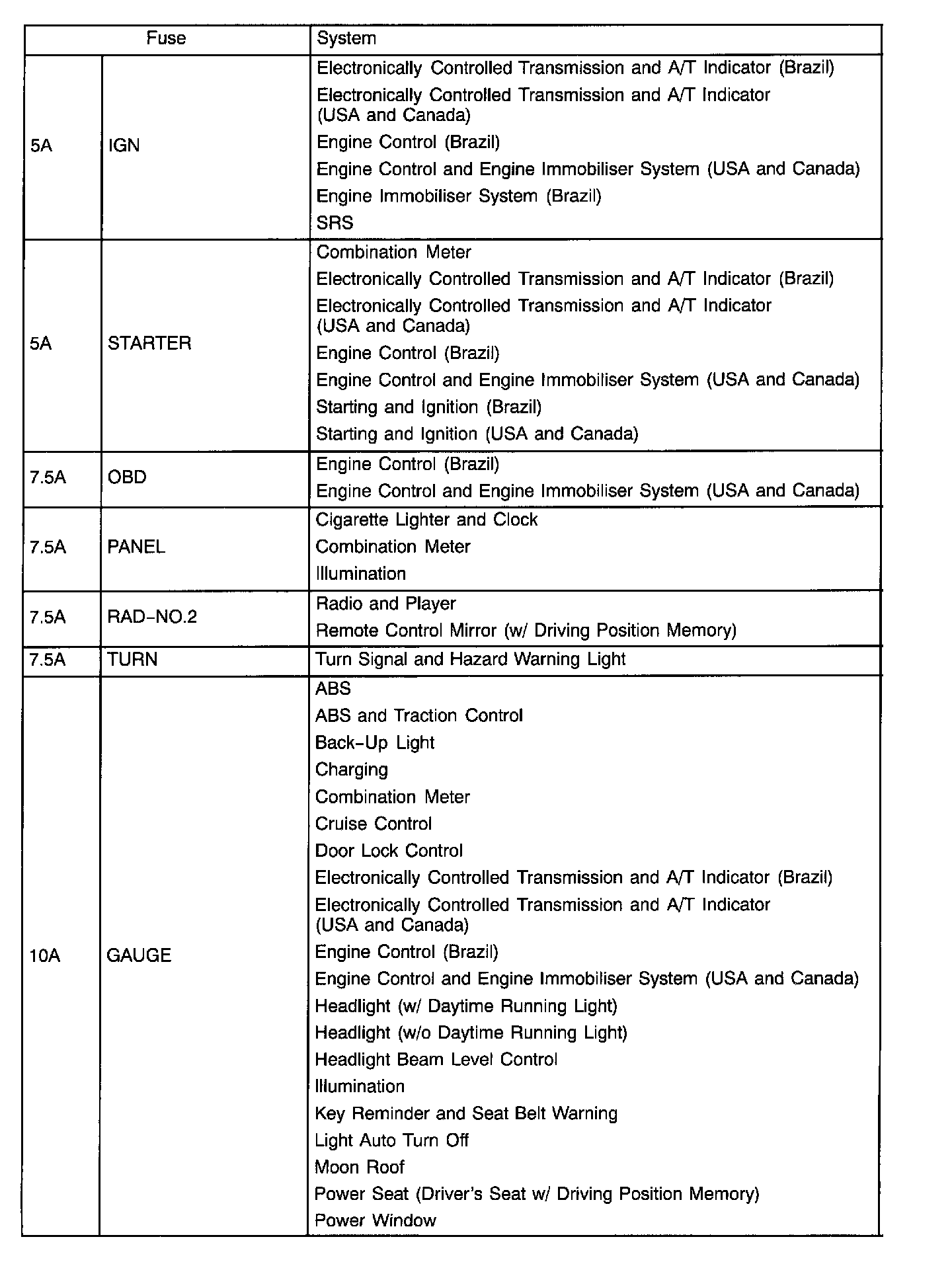 The chart shows the route by which current flows from the battery to each electrical source (Fusible Link, Circuit Breaker, Fuse, etc.) and other parts.