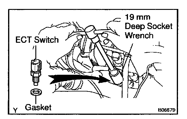 b. Using a 19 mm deep socket wrench, remove the ECT sensor and gasket.