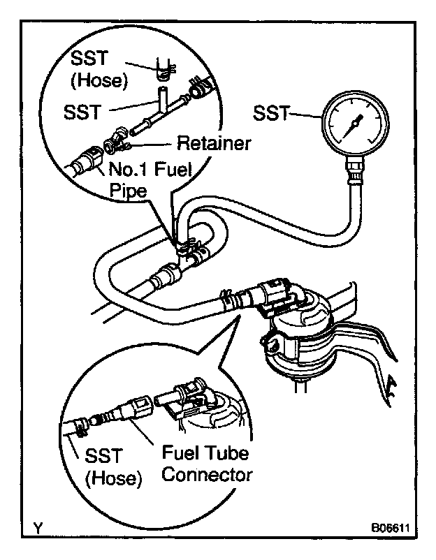 f. Install SST (pressure gauge) as shown in the illustration by using SST and fuel tube connector.