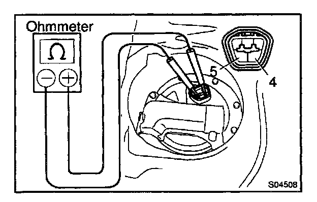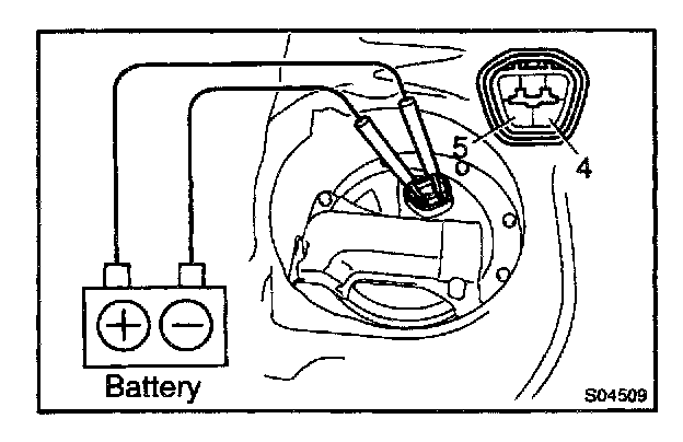 Connect the positive (+) lead from the battery to terminal 4 of the connector, and the negative (-) lead to terminal 5. Check that the fuel pump operates.