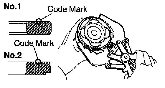 b. Using a piston ring expander, install the 2 compression rings with the code mark facing upward.