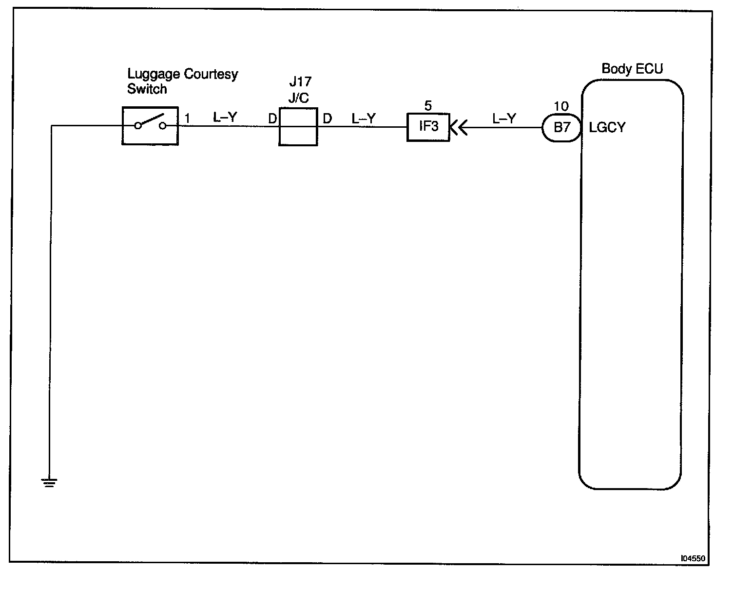 The luggage courtesy switch goes on when luggage compartment door is opened and goes off when luggage compartment door is closed.