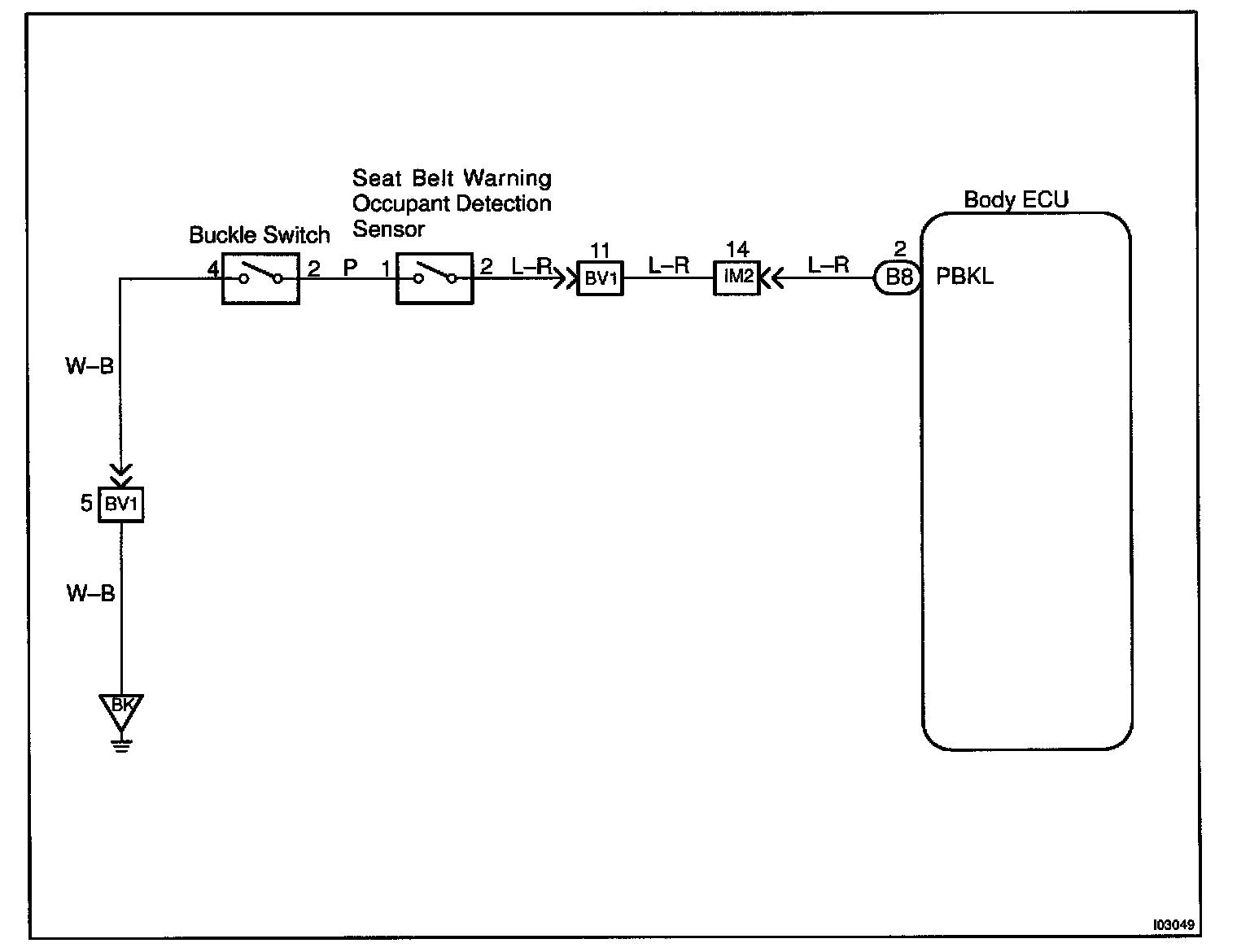 CIRCUIT DESCRIPTIONThis circuit detects the conditions of the passenger buckle switch and the seat belt warning occupant detection sensor, and makes the passenger seat belt warning flash.