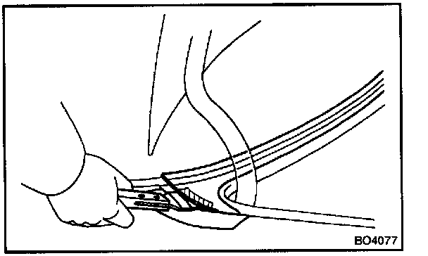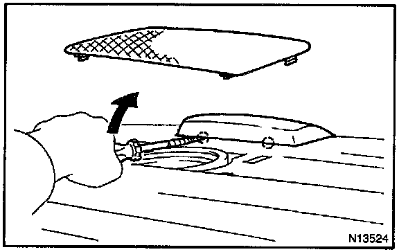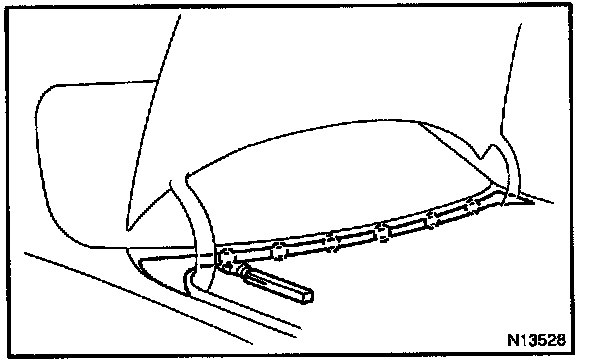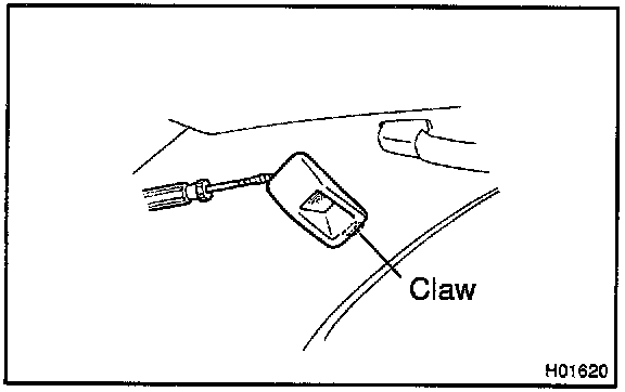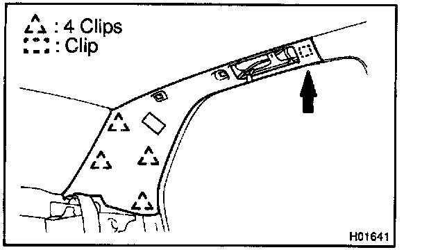 NOTE: Paying enough attention remove the clip on the roof side inner garnish shown in the illustration. Otherwise, the roof side inner garnish or the front pillar garnish might be broken.