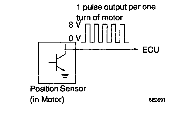 CIRCUIT DESCRIPTIONThe position sensor senses movement of the seat and send pulse signals to the ECU. The position sensor sends pulse to the ECU in proportion to the amount of seat movement, as shown in the diagram on the left.