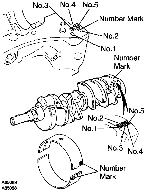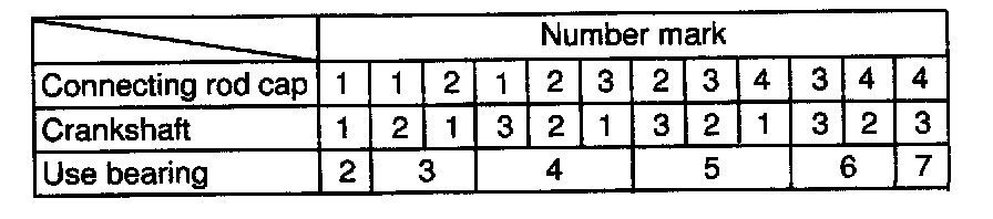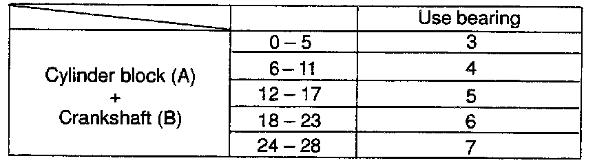 HINT: If using a standard bearing, replace it with one having the same number. If the number of the bearing cannot be determined, select the correct bearing by adding together the numbers imprinted on the cylinder block and crankshaft' then refer to the table for the appropriate bearing number. There are 5 sizes of the standard bearings. For No.1 and No.5 position bearings, use bearings marked "3", "4", "5", "6" and "7". For others position bearings, use bearings marked "1", "2", "3", "4" and "5".
