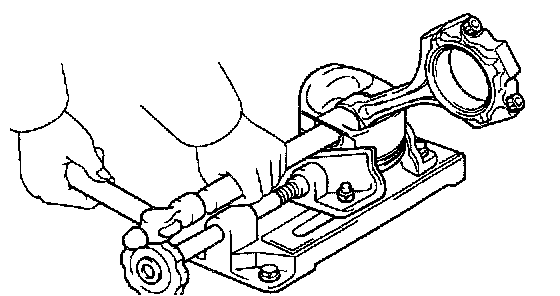 c. Using a plastic-faced hammer and brass bar, lightly tap out the piston pin and pin and remove the connecting rod.
