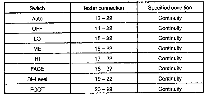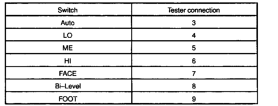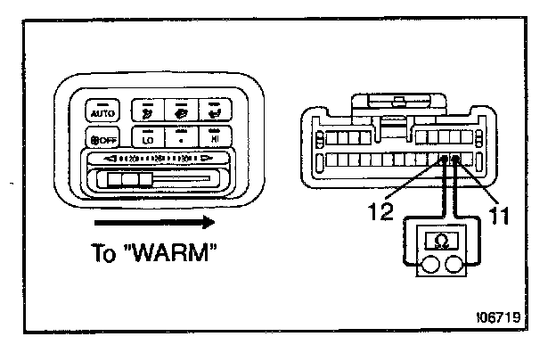 b. Gradually move the temperature control lever from "COOL" side to "WARM" side then check that the resistance between terminals 11 and 12 increase from 0 to 3.0 kOhms