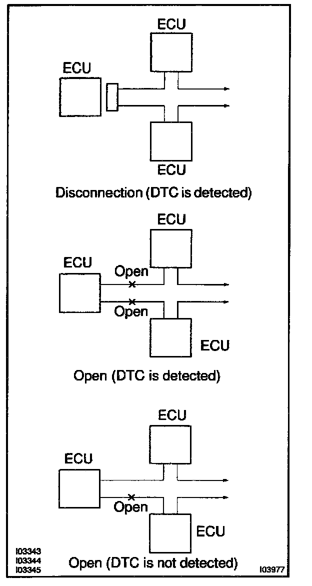 B. If DTC of ECU communication stop is output, there is a possibility of connector disconnection or 2 communication buses open. It will not become abnormal with only 1 communication bus open.