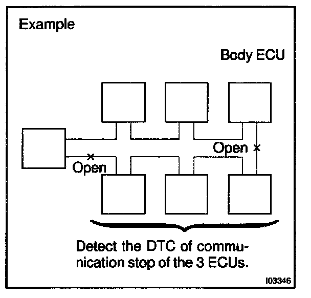 A. As shown in the illustration, each ECU of this vehicle is connected by communication bus and it transmits each signal by communication. This communication bus is self-diagnosed by Body ECU and it memorizes DTC when it detects communication stop to ECU or communication bus +B short or GND short. There is a possibility that Body ECU cannot self-diagnose accurately unless it doesn't work normal. So, please note that the troubleshooting of Body Electrical System should be done after confirming if Body ECU and Open door indicator works normal by "BASIC INSPECTION" Component Tests and General Diagnostics.