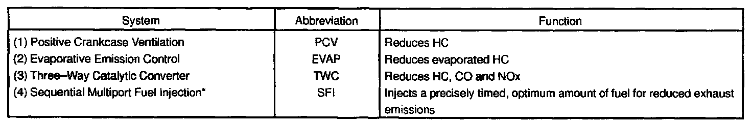 The emission control Systems are installed to reduce the amount of HC, CO and NOx exhausted from the engine ((3) and (4)), to prevent the atmospheric release of blow-by gas-containing HC (1) and evaporated fuel containing HC being released from the fuel tank (2).