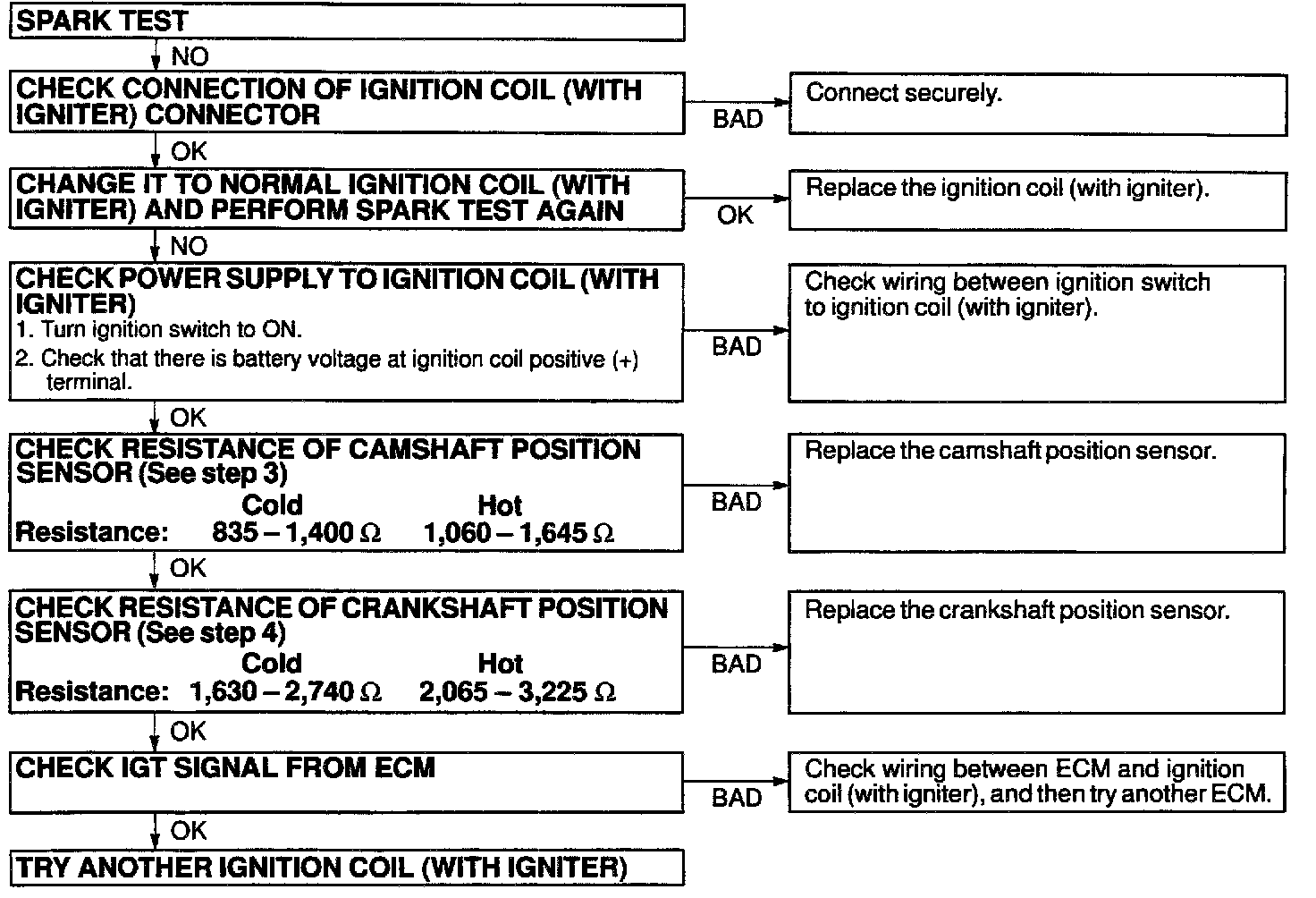 NOTE: "Cold" and "Hot" in these sentences express the temperature of the coils themselves. "Cold" is from -10 °C (14 °F) to 50 °C (122 °F) and "Hot" is from 50 °C (122 °F) to 100 °C (212 °F).INSPECT IGNITION COIL (WITH IGNITER) AND SPARK TEST