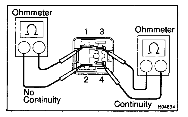 a. Using an ohmmeter, check that there is continuity between terminals 3 and 4. If there is no continuity, replace the relay.