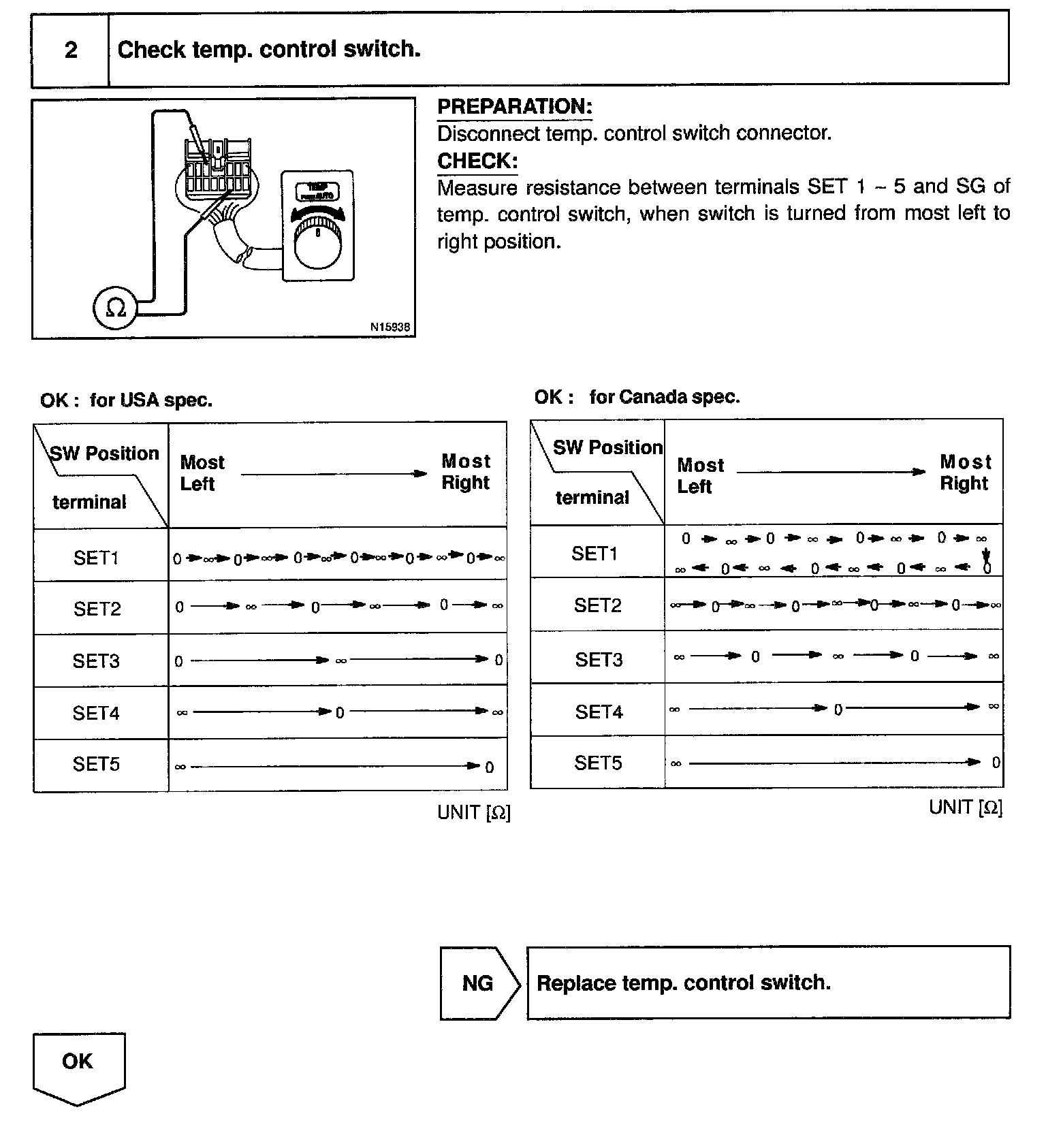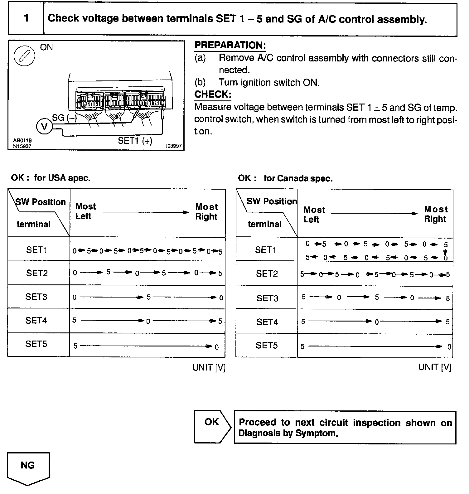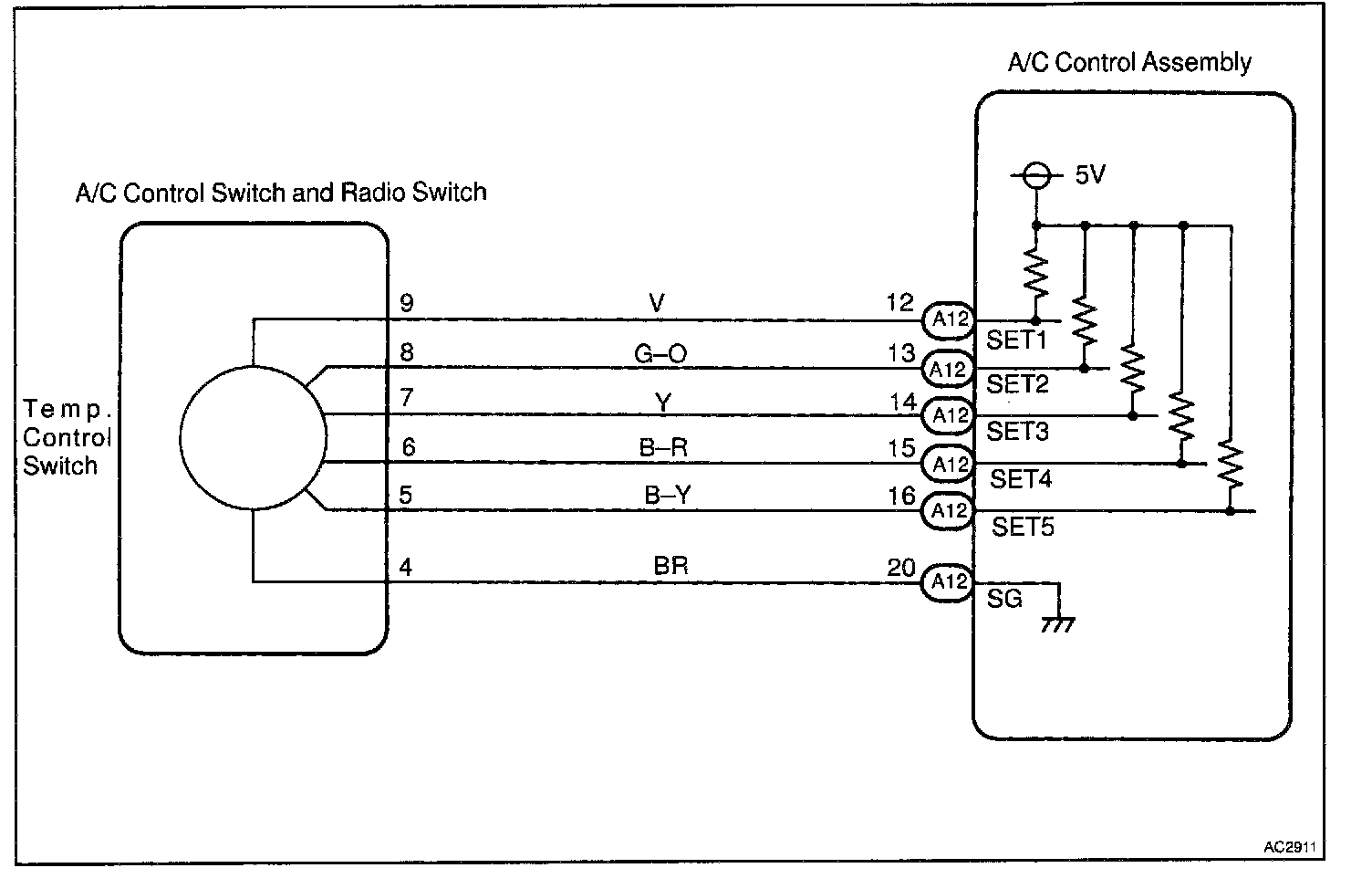 The ECU calculates the set temperature from the combination of Hi (5 V) or Low (0 V) terminals SET 1 - 5 of the temperature control SW and displays the set temperature on the LCD display.