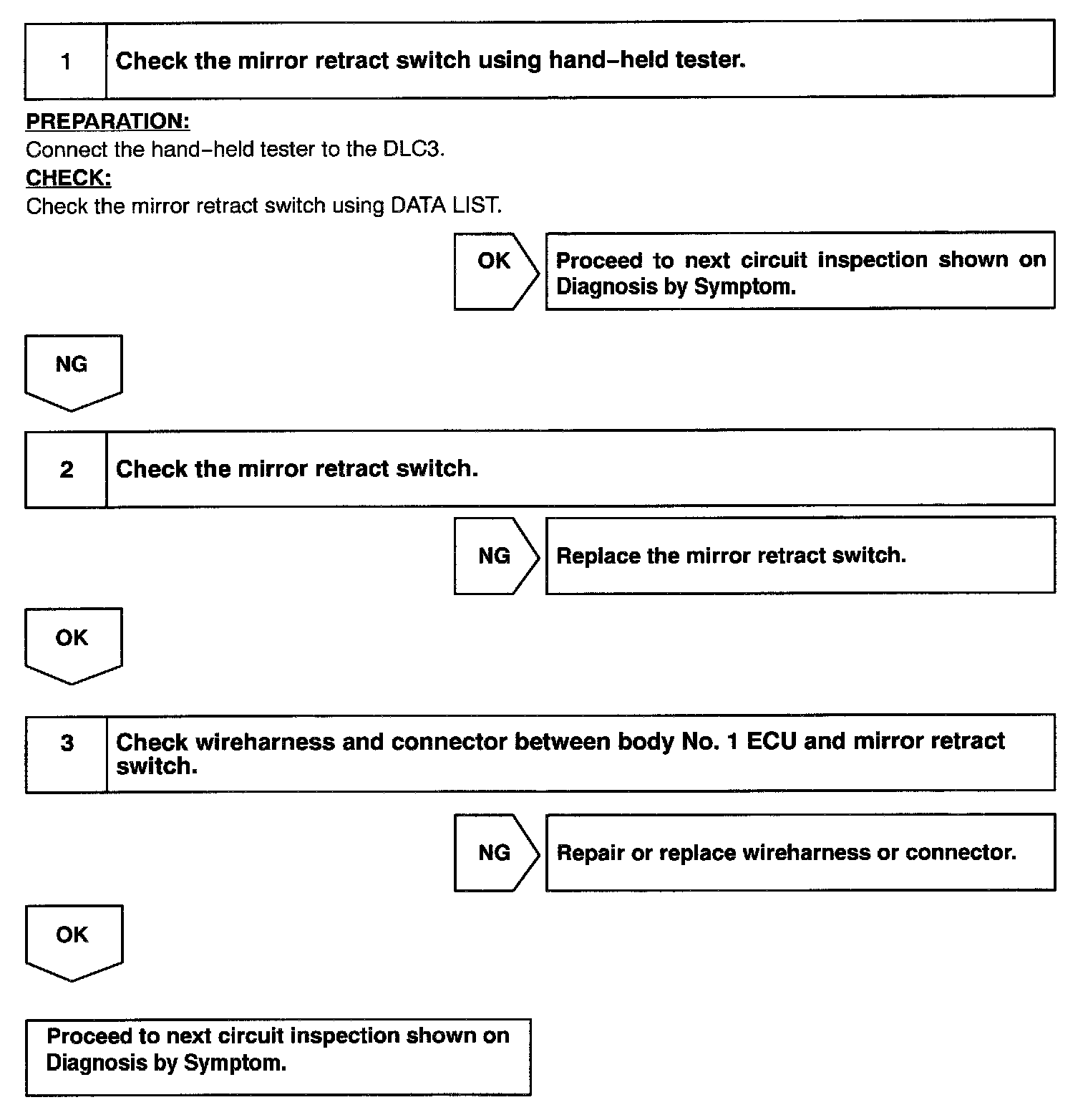 The operating condition of the mirror retract is input by the body ECU No.1 and the input signals are sent to the driver door ECU or the passenger door ECU.