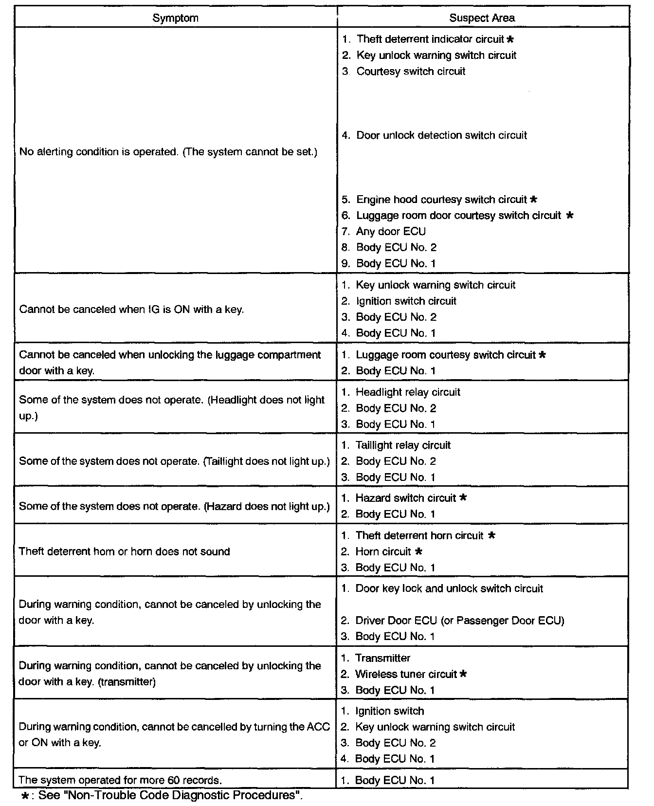 Problem Symptoms Table - Theft Deterrent System: