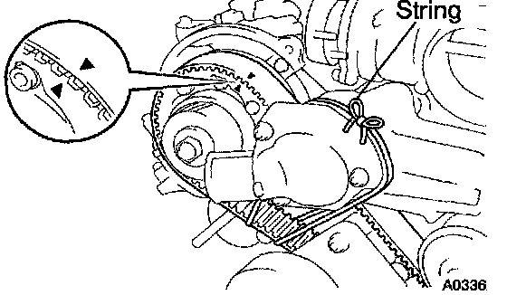 To avoid meshing of the timing pulley and timing belt, secure one of them with string. And place matchmarks on the timing belt and RH camshaft timing pulley.