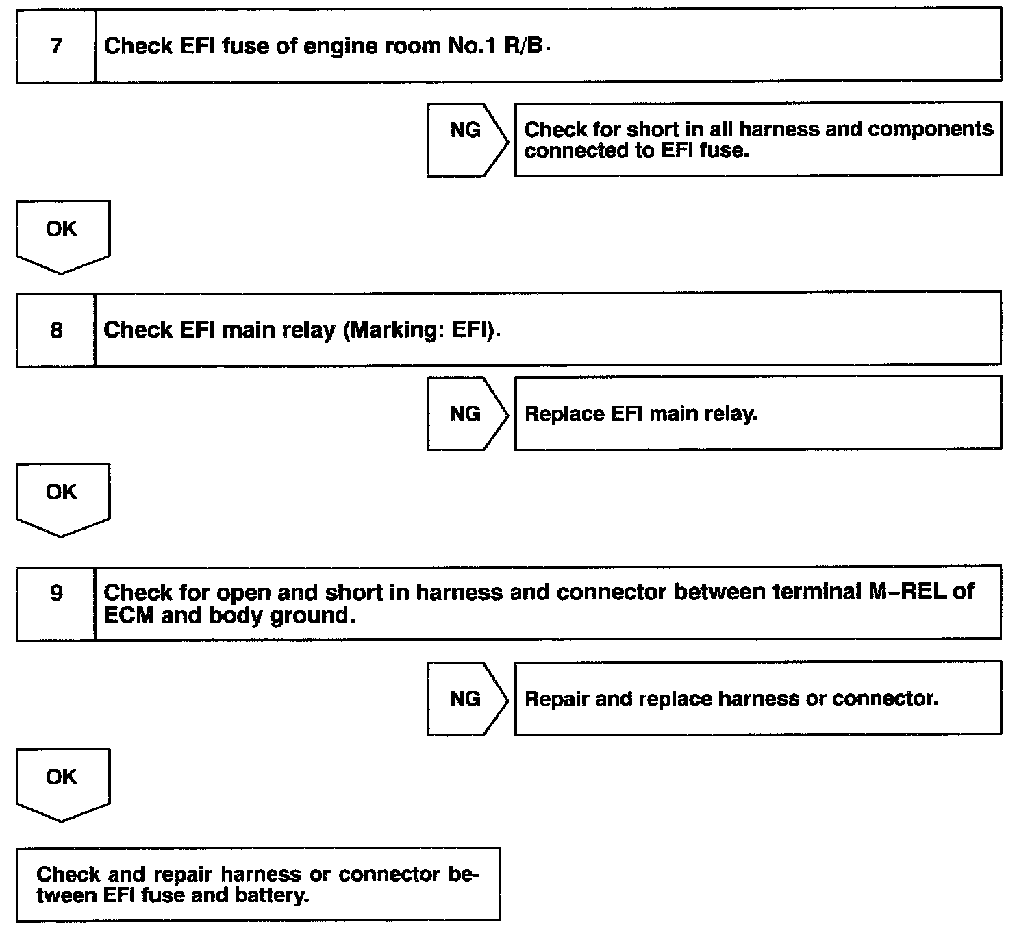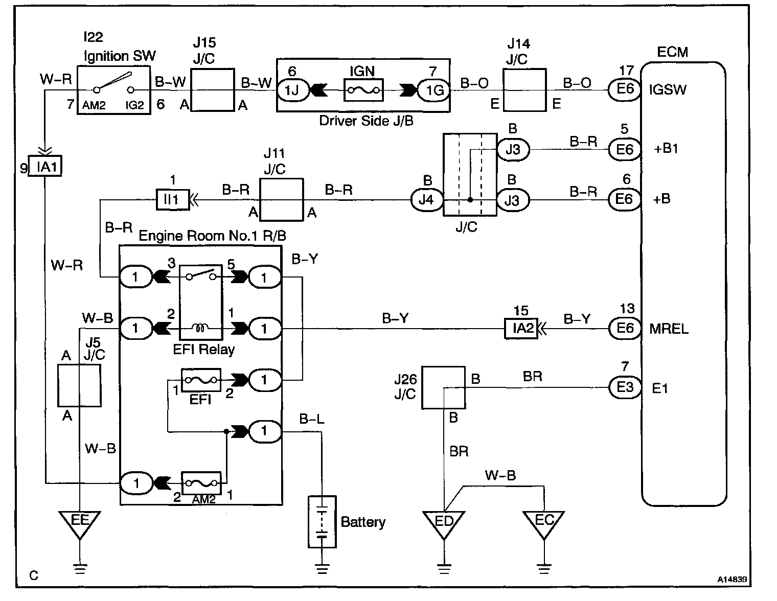 When the ignition switch is turned ON, battery positive voltage is applied to terminal IGSW of the ECM and the EFI main relay (Marking: EFI) control circuit in the ECM sends a signal to terminal MREL of the ECM switching on the EFI main relay.