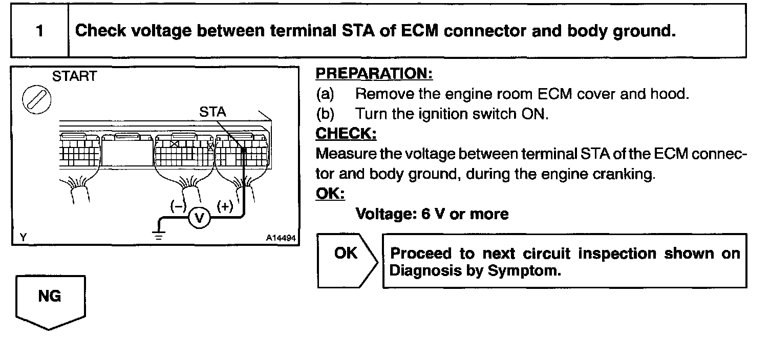HINT: This diagnostic chart is based on the premise that the engine is cranked normally. If the engine is not cranked, proceed to the Diagnosis by Symptom table.