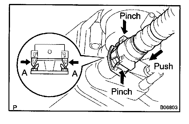Push the connector deep inside, pinch portion A, and pull out the connector.