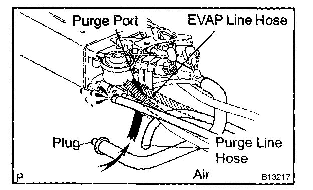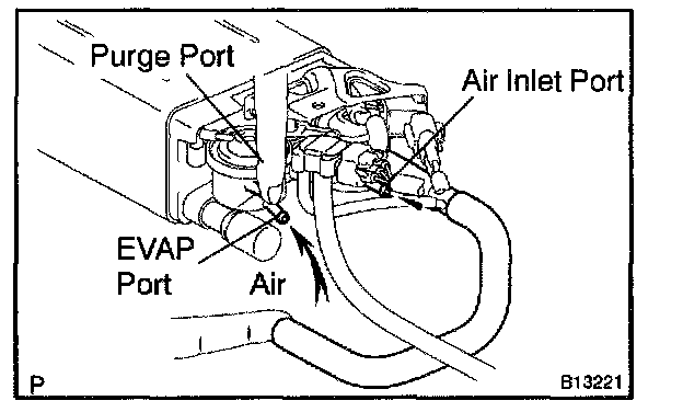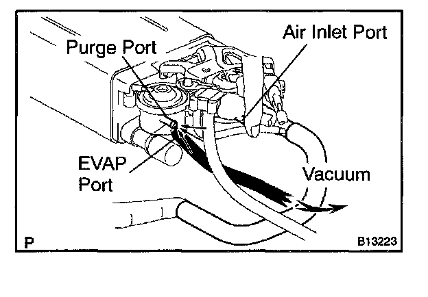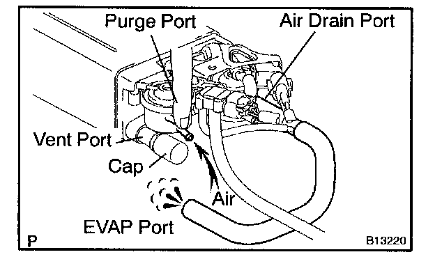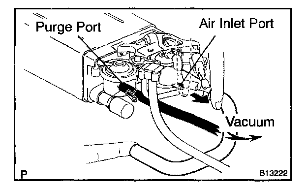 5. While holding the air inlet port closed, apply vacuum (3.43 kPa, 25.7 mmHg, 1.01 in.Hg) to the EVAP port and check that air flows into the purge port.