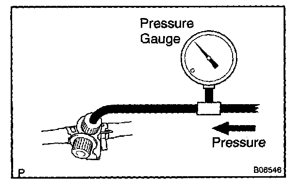 a. Disconnect the EVAP line hose from the charcoal canister side and then pressurize and make the internal pressure in the fuel tank 4 kPa (41 gf/sq.cm, 0.58 psi).
