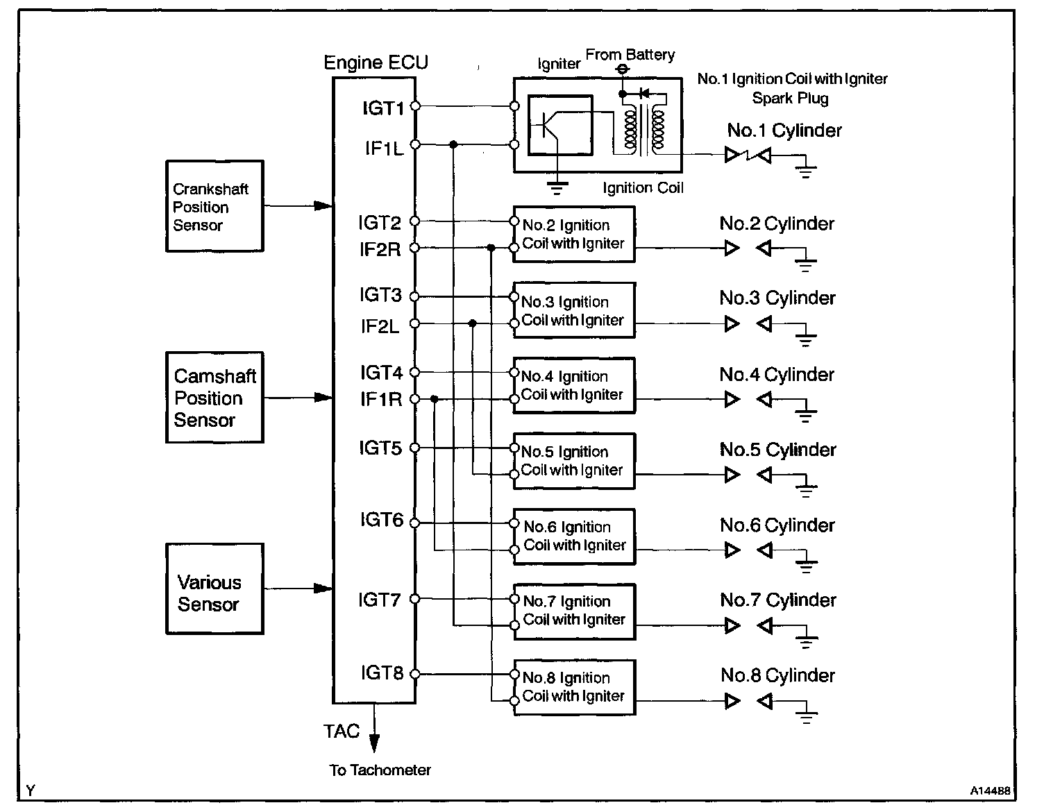 The ECM determines ignition timing and outputs the ignition signals (IGT) for each cylinder. Based on IGT signals, the power transistors in the igniter cuts off the current to the primary coil in the ignition coil is supplied to the spark plug that are connected to the end of the secondary coil. At the same time, the igniter also sends an ignition confirmation signal (IGF) as a fail-safe measure to the ECM.