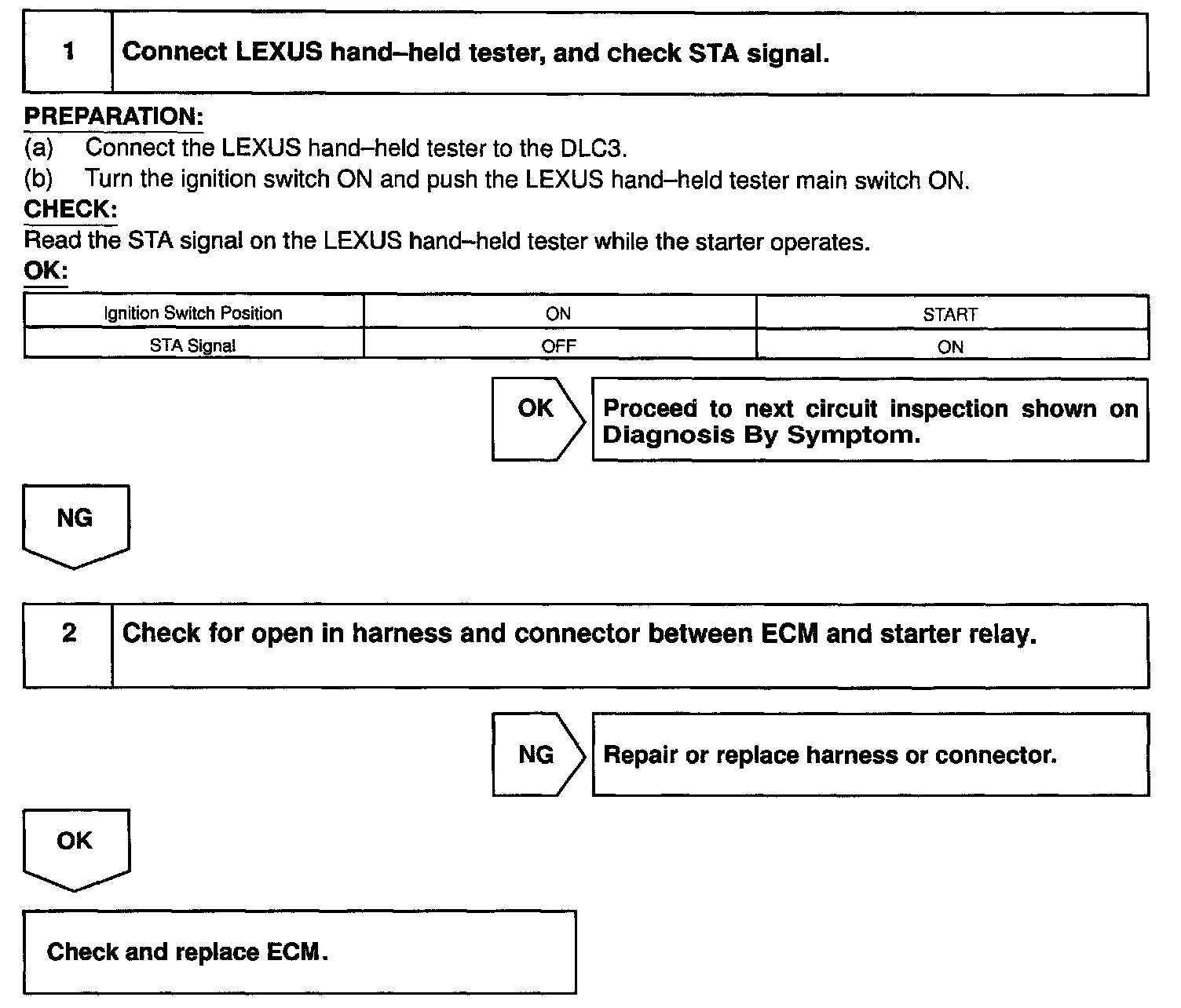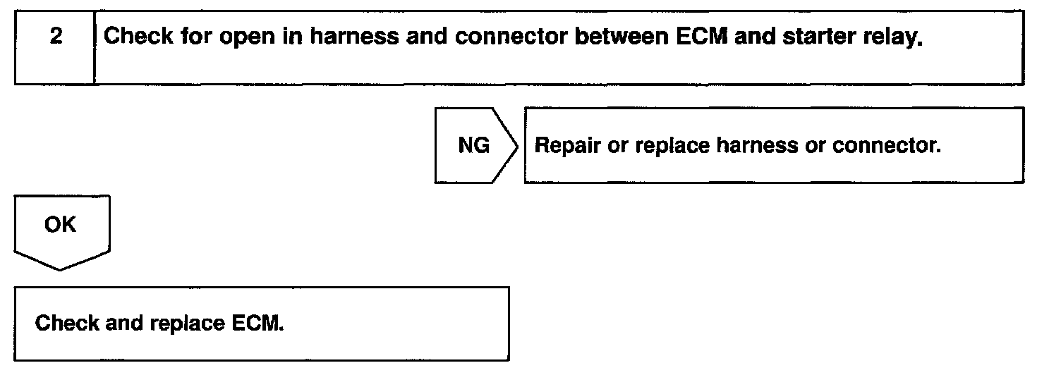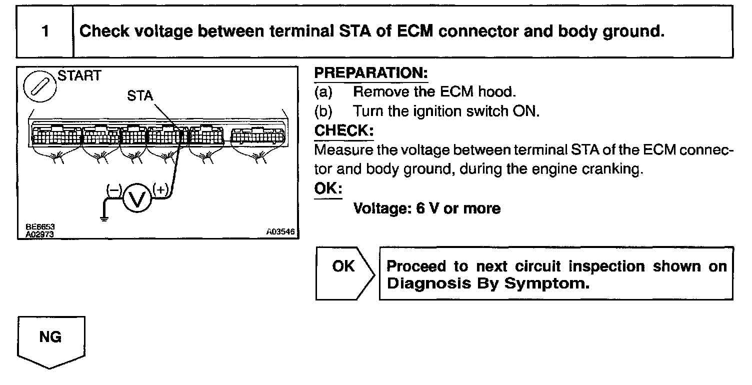 CIRCUIT DESCRIPTIONWhen the engine is cranked, the intake air flow is slow, so fuel vaporization is poor. A rich mixture is therefore necessary in order to achieve good startability. While the engine is being cranked, the battery positive voltage is applied to terminal STA of the ECM. The starter signal is mainly used to increase the fuel injection volume for the starting injection control and after-start injection control.
