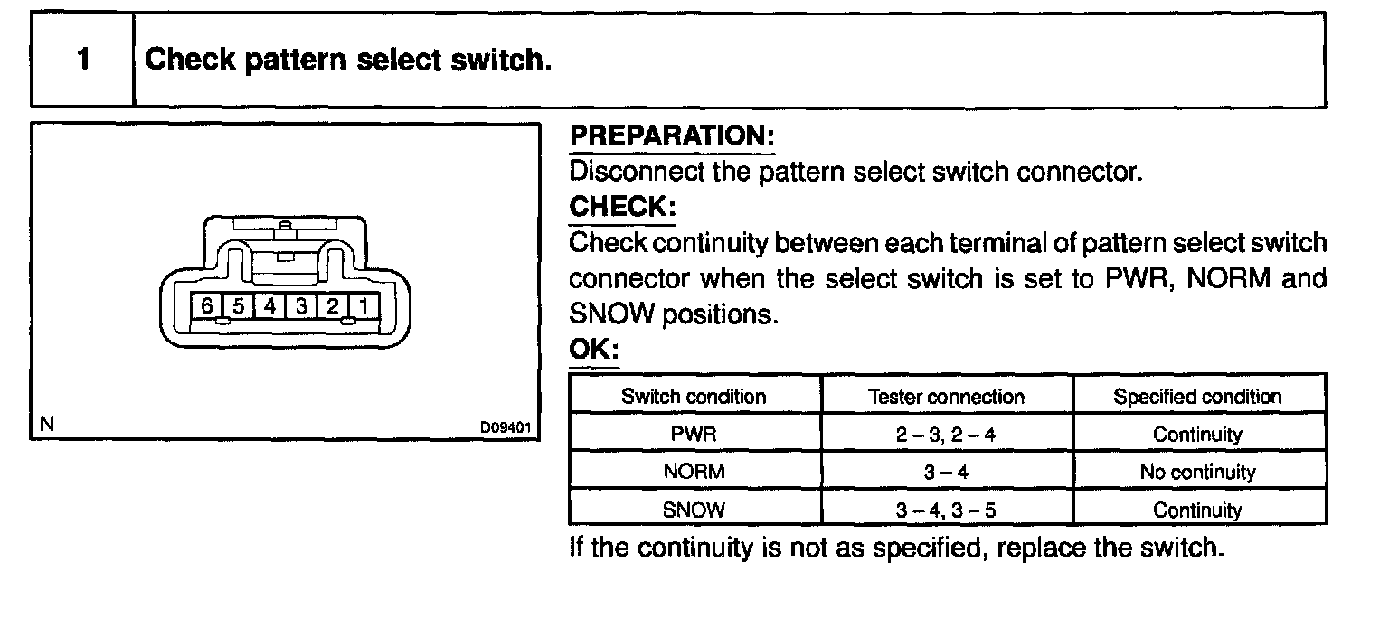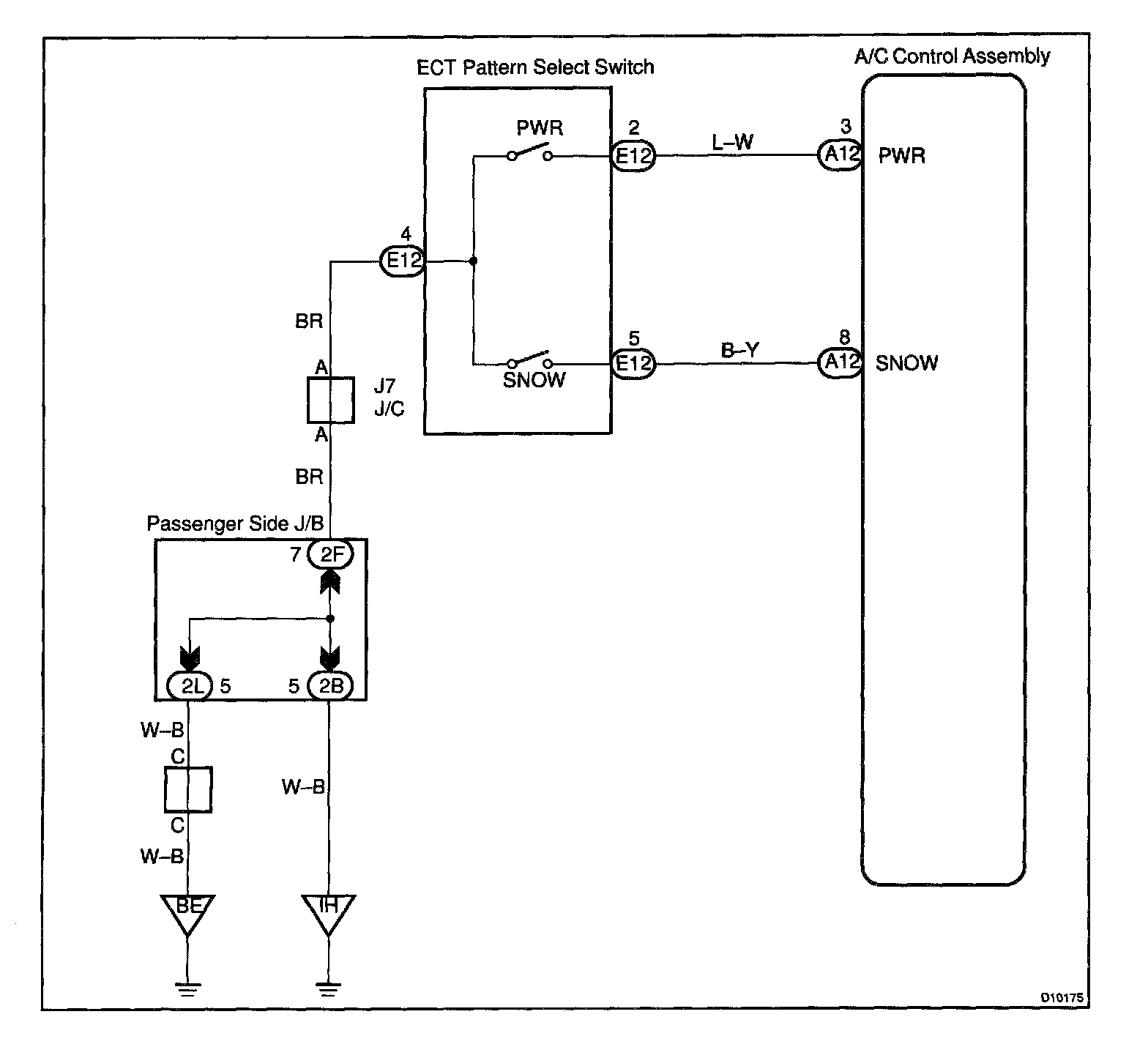 CIRCUIT DESCRIPTIONThe ECM memory contains the shift programs for the NORMAL, POWER and SNOW patterns, 2 position, L position and the lock-up patterns. By following the programs corresponding to the signals from the pattern select switch, the park/neutral position and other various sensors, the ECM switches the solenoid valves ON and OFF, and controls the transmission gear change and the lock-up clutch operation.