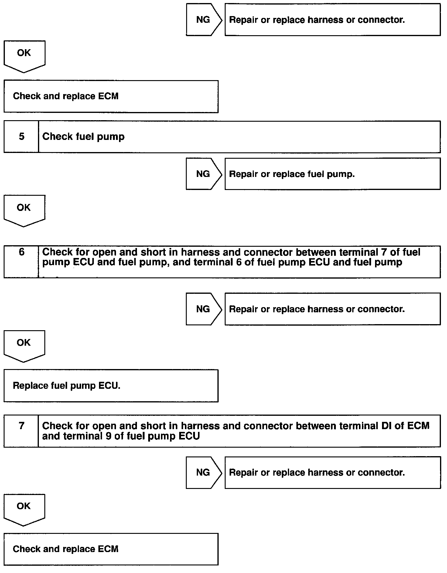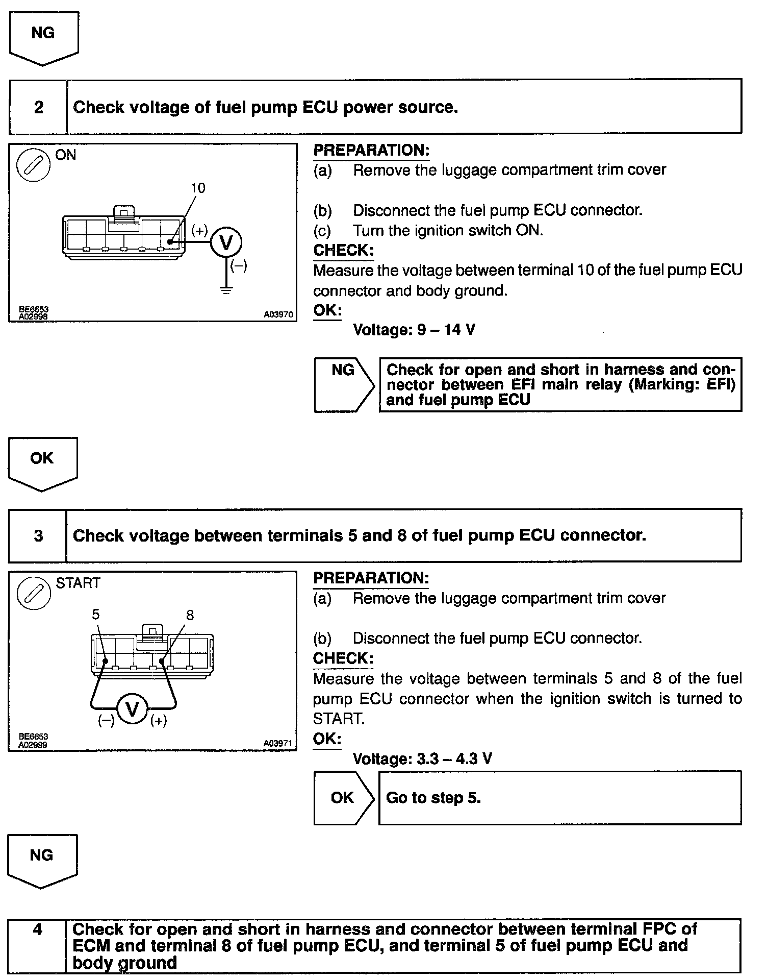 The fuel pump speed is controlled at 3 steps (high speed, medium speed, low speed) by the condition of the engine (starting, idling, light load, heavy load), when the engine starts (STA ON) or heavy loads with engine high speed, the ECM sends a Hi signal (about 3.8 V) to the fuel pump ECU (FPC terminal). The fuel pump ECU then outputs Hi voltage (battery positive voltage) to the fuel pump so that the fuel pump operates at high speed. When the heavy loads with engine low speed, the ECM sends a Mid signal (about 2.5 V) to the fuel pump ECU (FPC terminal). The fuel pump ECU then outputs Mid voltage (about 10 V) to the fuel pump so that the fuel pump operates at medium speed.