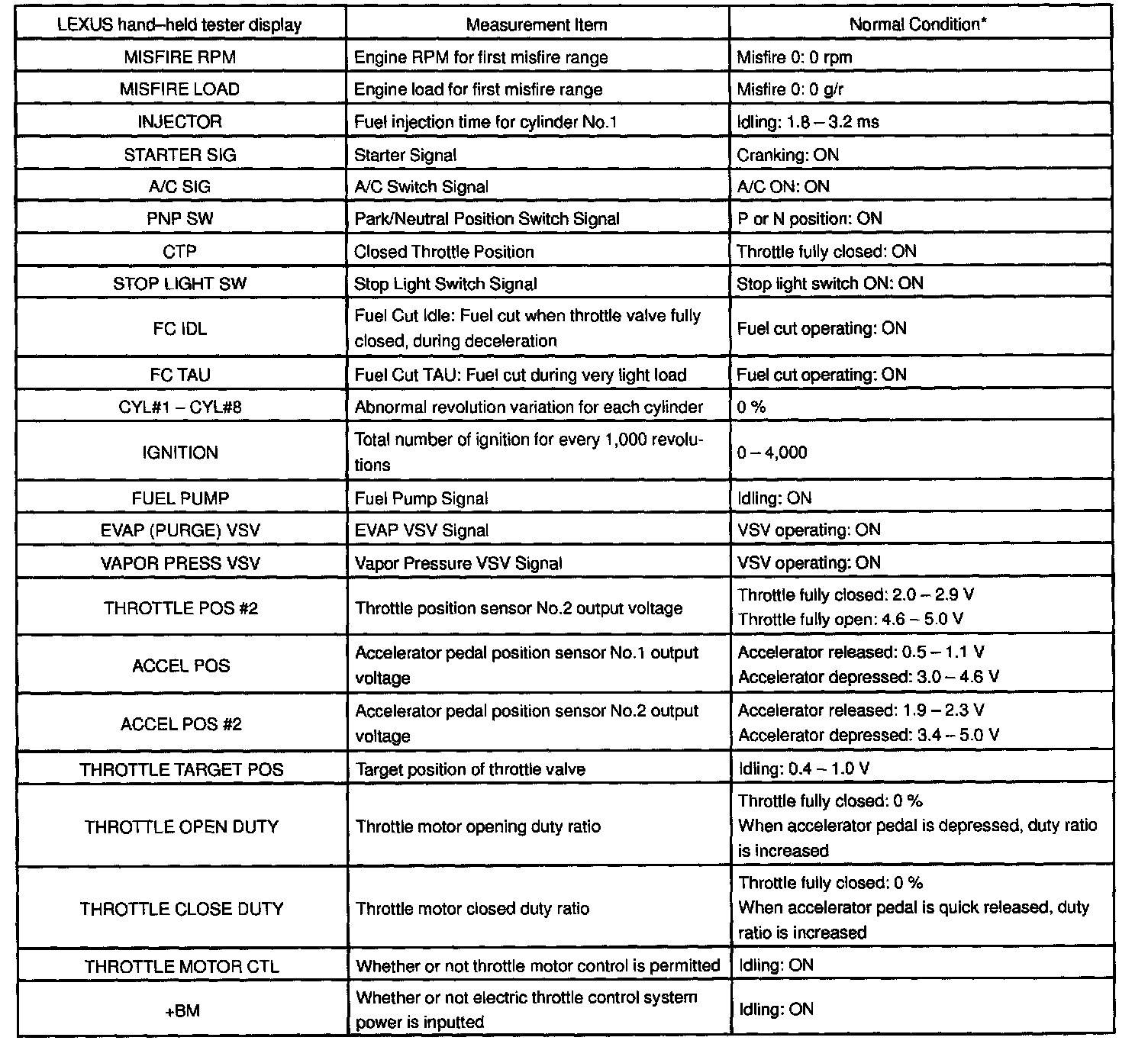 ENGINE OPERATING CONDITIONNOTE: The values given for "Normal Condition" are representative values, so a vehicle may still be normal even if its value varies differ from those listed here. So do not decide whether a part is faulty or not solely according to the "Normal Condition" here.