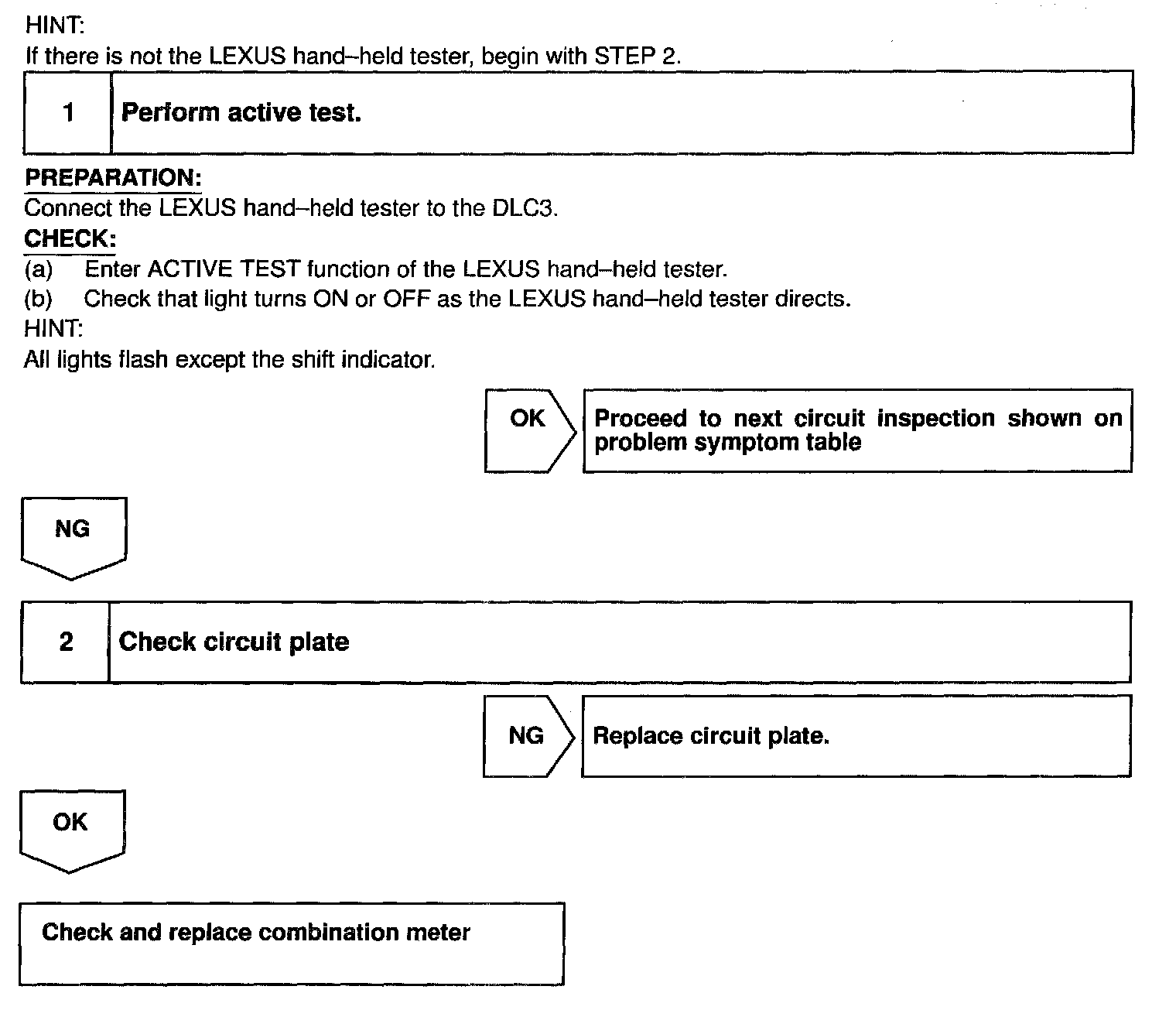 Some warnings and indicators on the combination meter can be active-tested with the LEXUS hand-held tester.