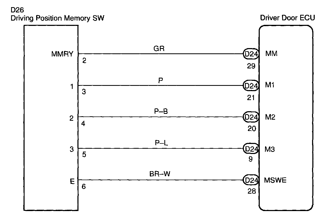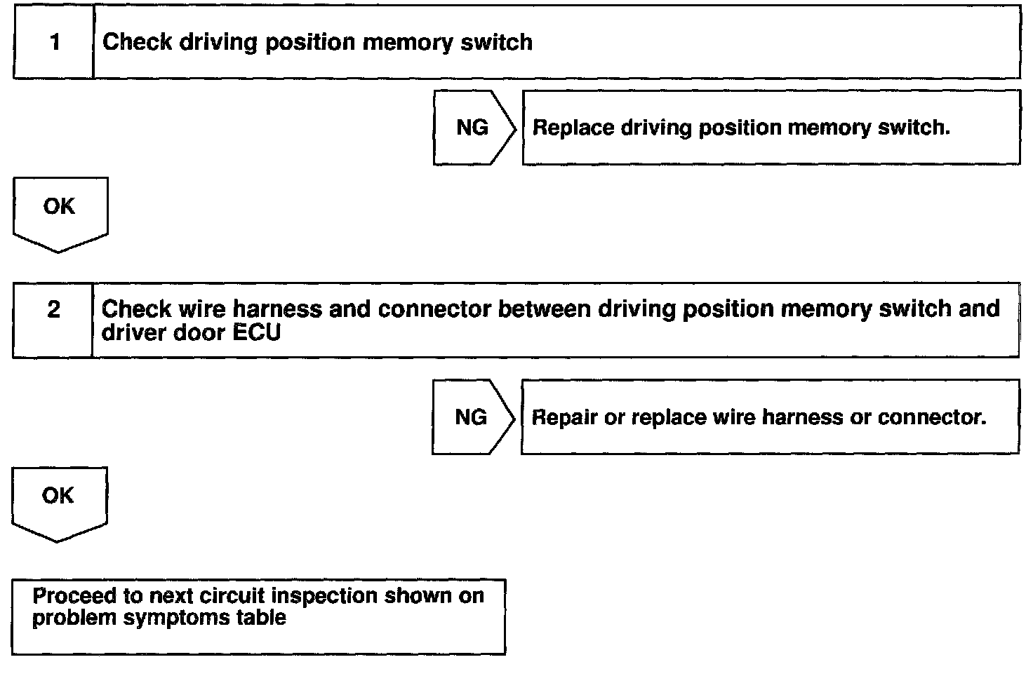 CIRCUIT DESCRIPTIONThe driver door ECU detects the condition of the driving memory switch and sends the information to the power seat ECU and the tilt and telescopic ECU via the multiplex communication circuit.