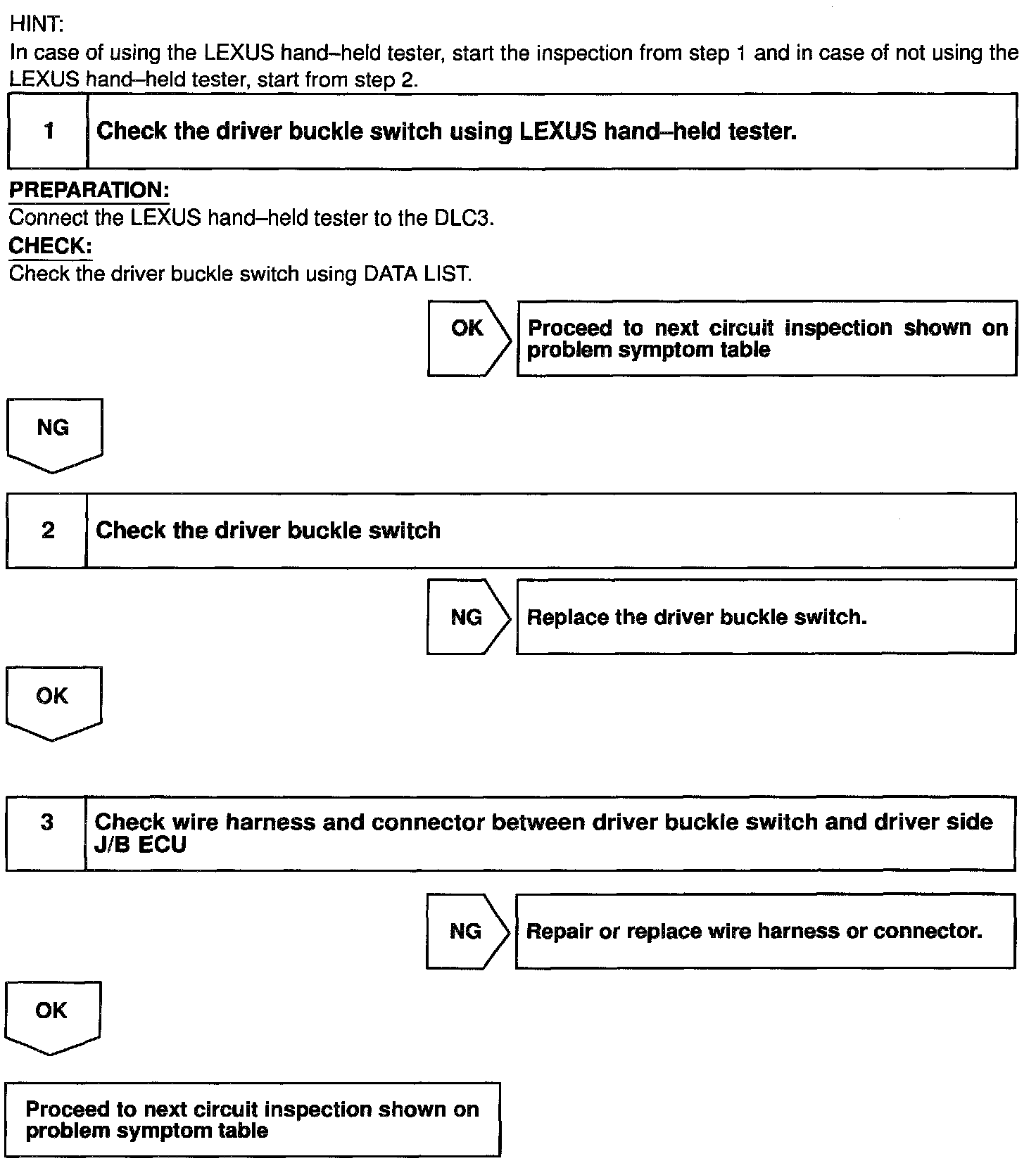 CIRCUIT DESCRIPTIONThis circuit detects the conditions of the driver buckle switch and makes the driver seat warning flash.