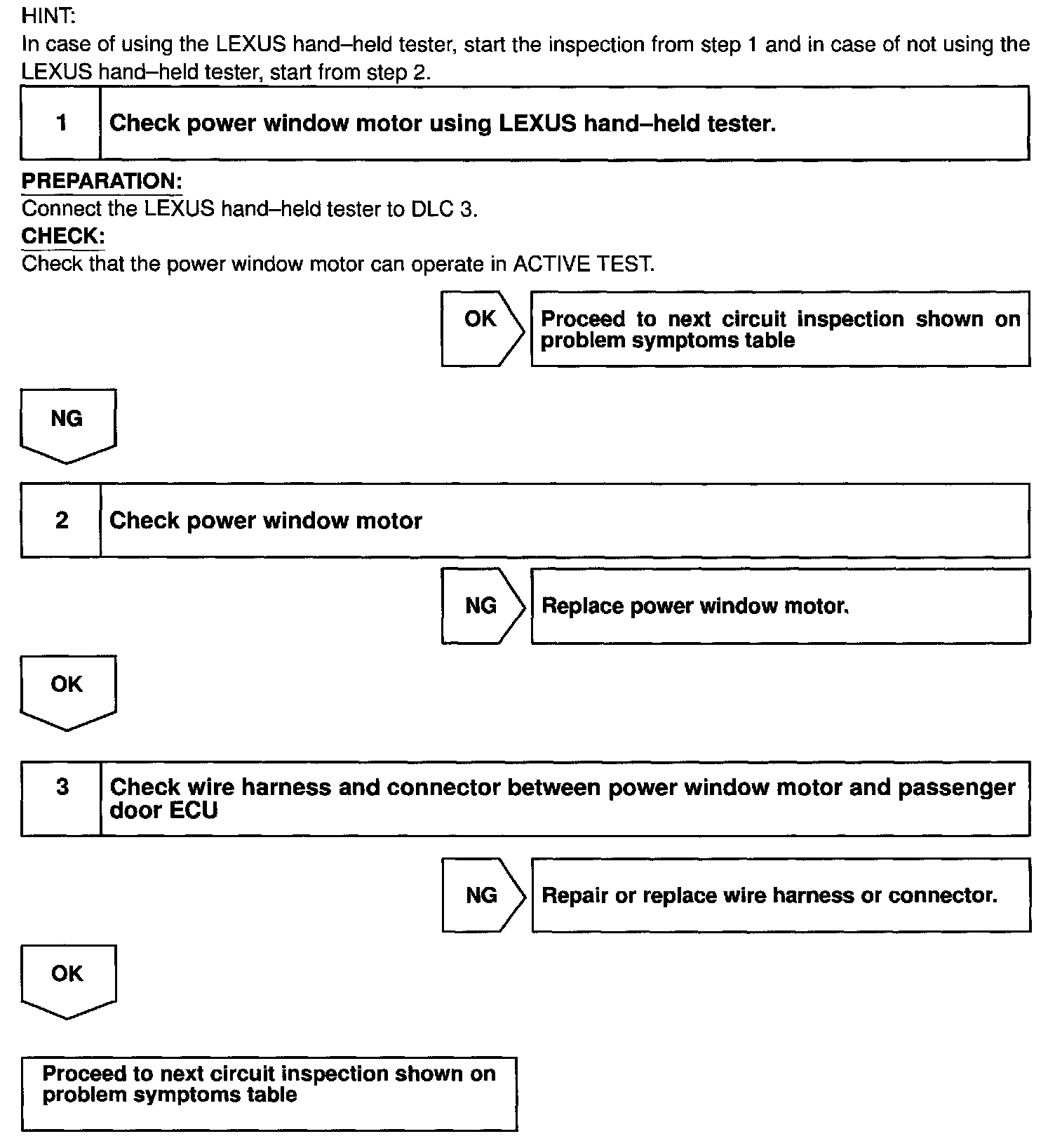 The passenger door ECU receives the passenger door power window switch signal from the master switch to operate the power window motor.