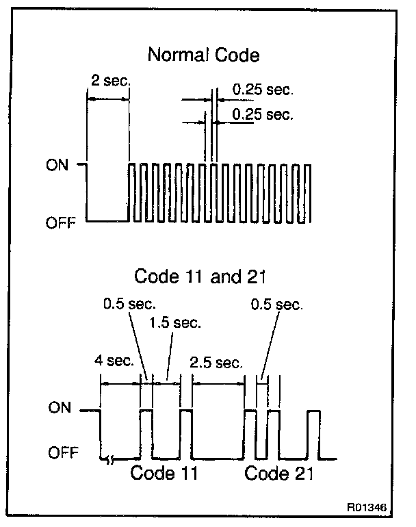 - As an example, the blinking patterns for the normal code and codes 11 and 21 are shown on the left.
