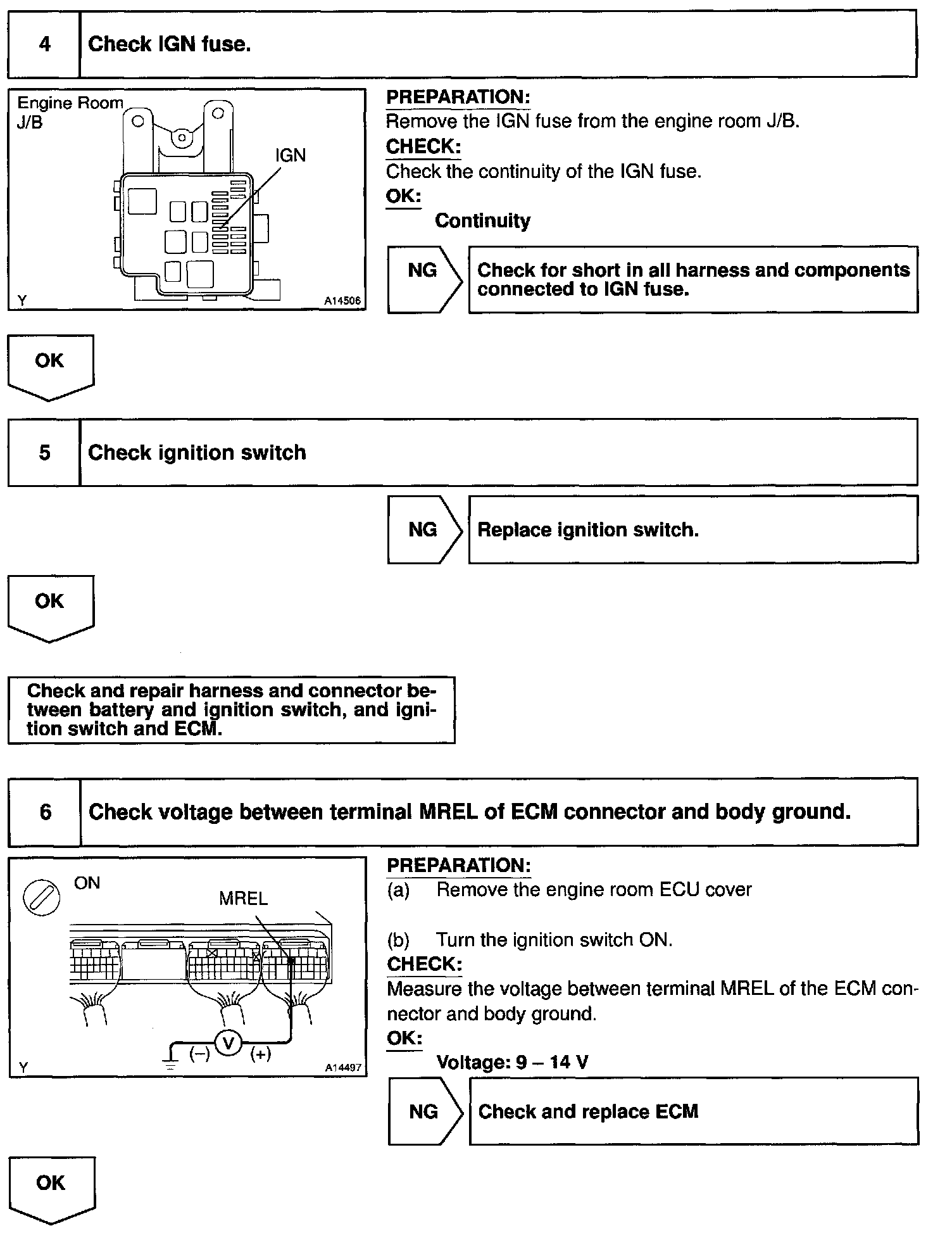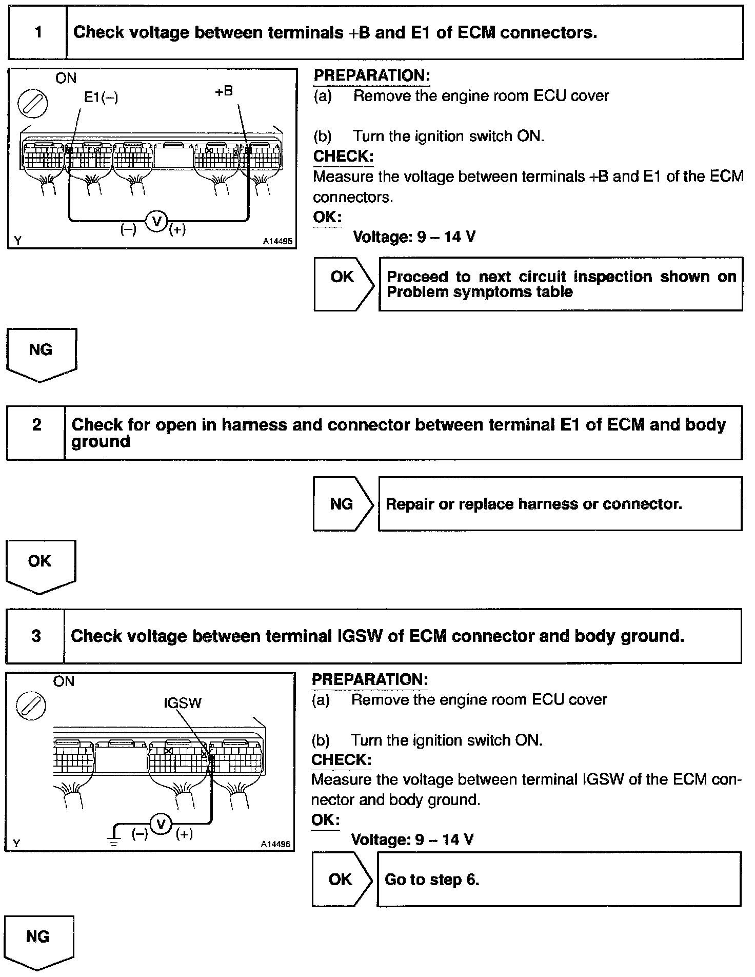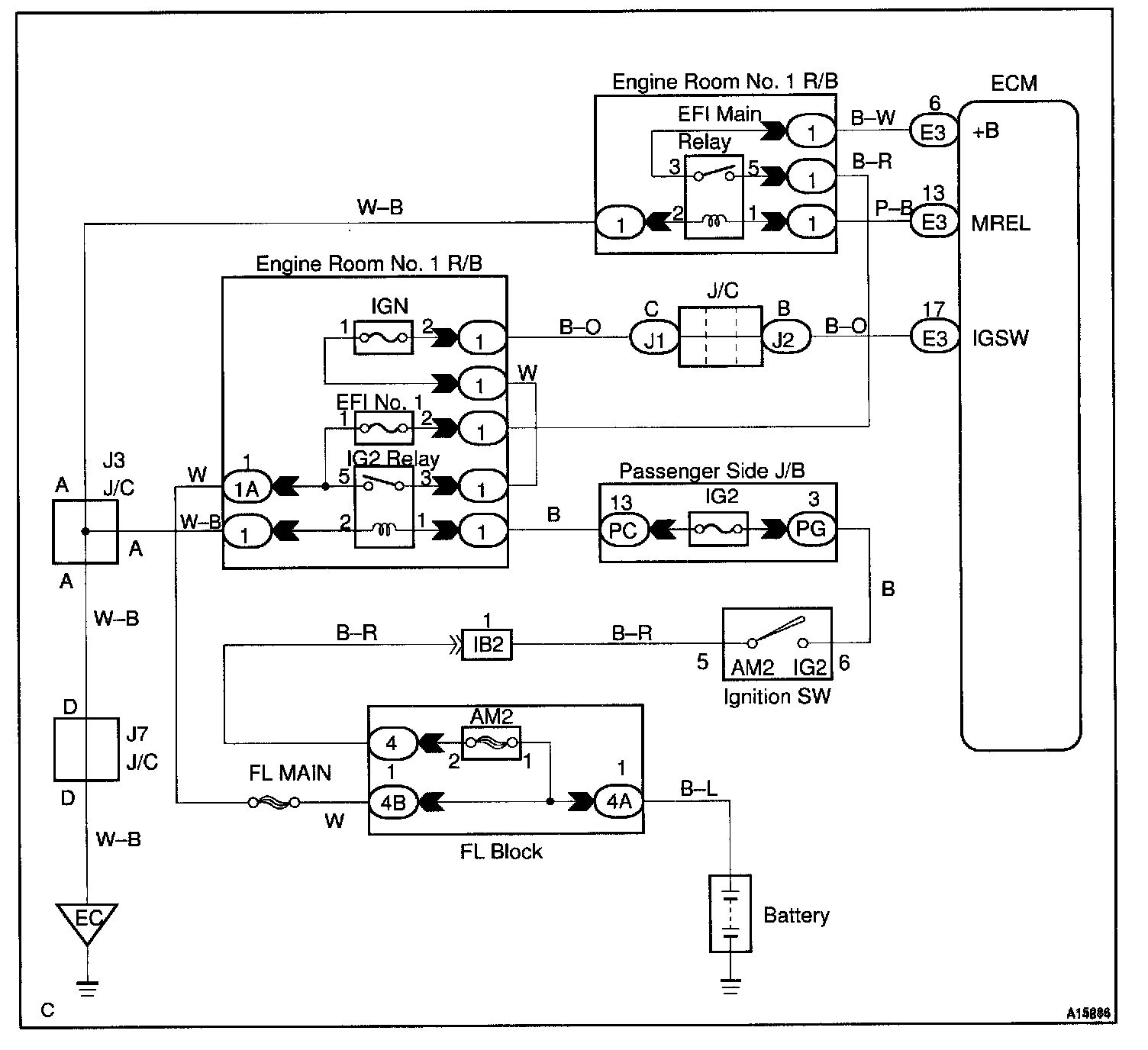 This signal causes current to flow to the coil, closing the contacts of the EFI main relay and supplying power to terminal +B of the ECM.
