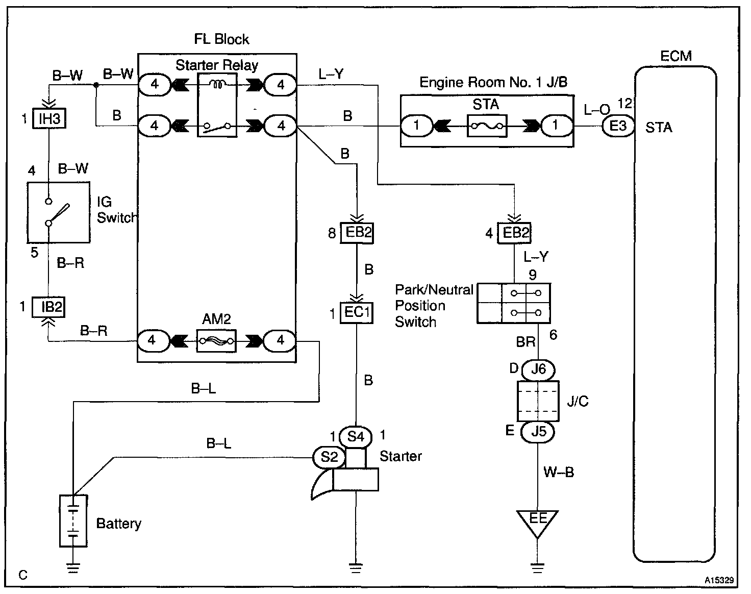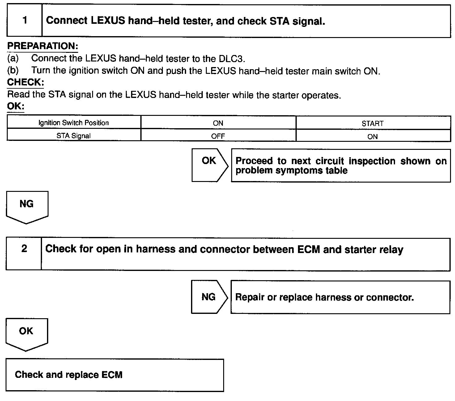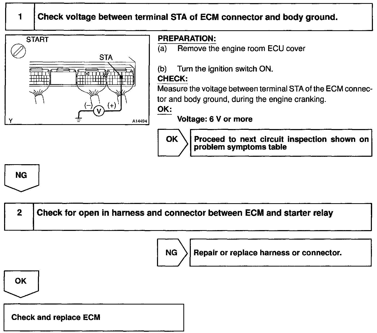 CIRCUIT DESCRIPTIONWhen the engine is cranked, the intake air flow is slow, so fuel vaporization is poor. A rich mixture is therefore necessary in order to achieve good startability. While the engine is being cranked, the battery positive voltage is applied to terminal STA of the ECM. The starter signal is mainly used to increase the fuel injection volume for the starting injection control and after-start injection control.